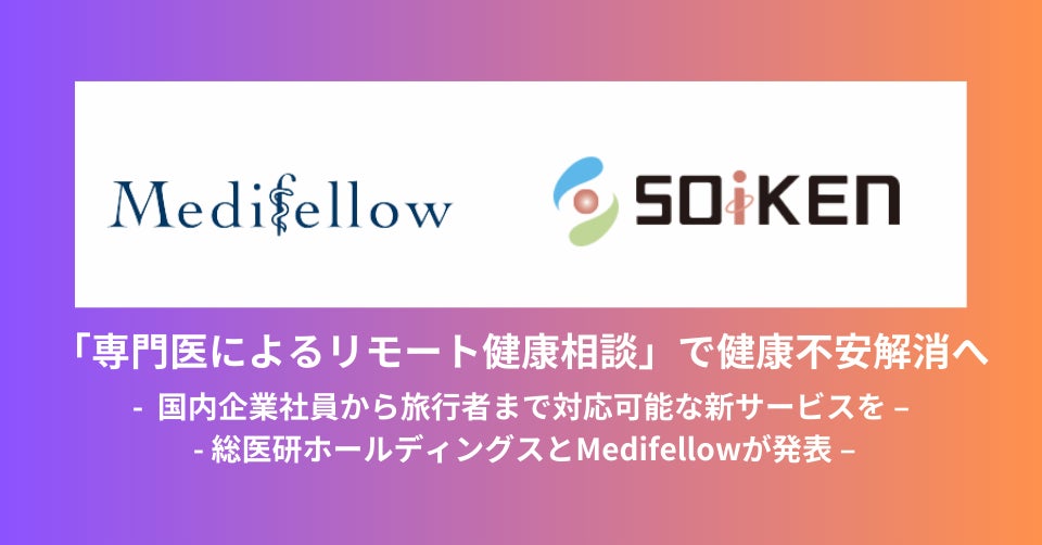 株式会社総医研ホールディングス(本社:大阪府豊中市、代表取締役:角田 真佐夫、東証グロース:2385)は、株式会社Medifellow(本社:東京都港区、代表取締役CEO:丹羽崇)との業務提携を発表いたします。この提携により、国内企業の社員から海外からの旅行者まで、幅広い利用者に対応可能な専門医によるリモート健康相談サービスを提供いたします。