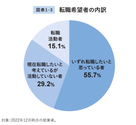 リクルートワークス研究所の「WorksReport2023」調査によると、転職希望者の中で1年以内に転職したいけどしなかったは87%、約1,219万人となっており、転職したいけど転職しない潜在層が多くいることが分かりました。