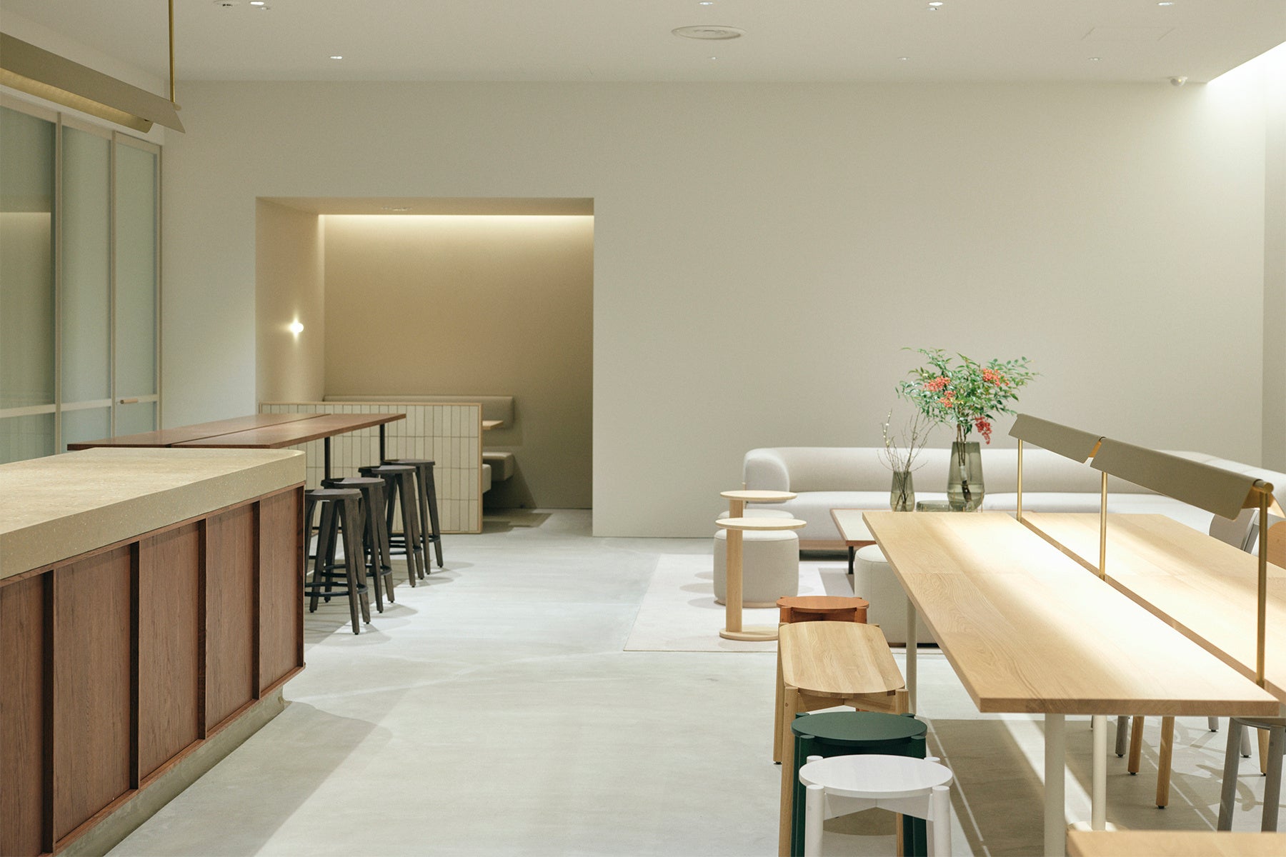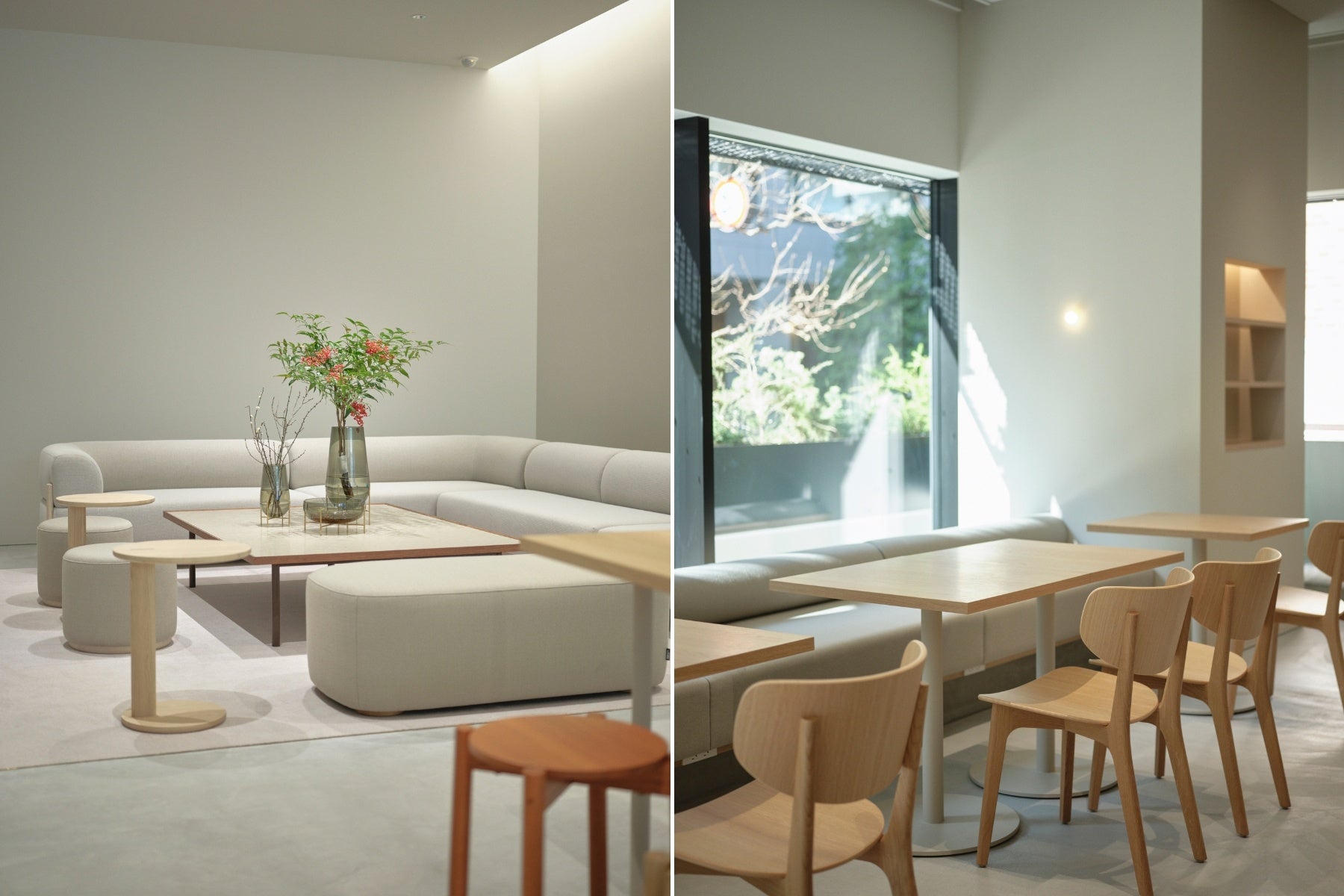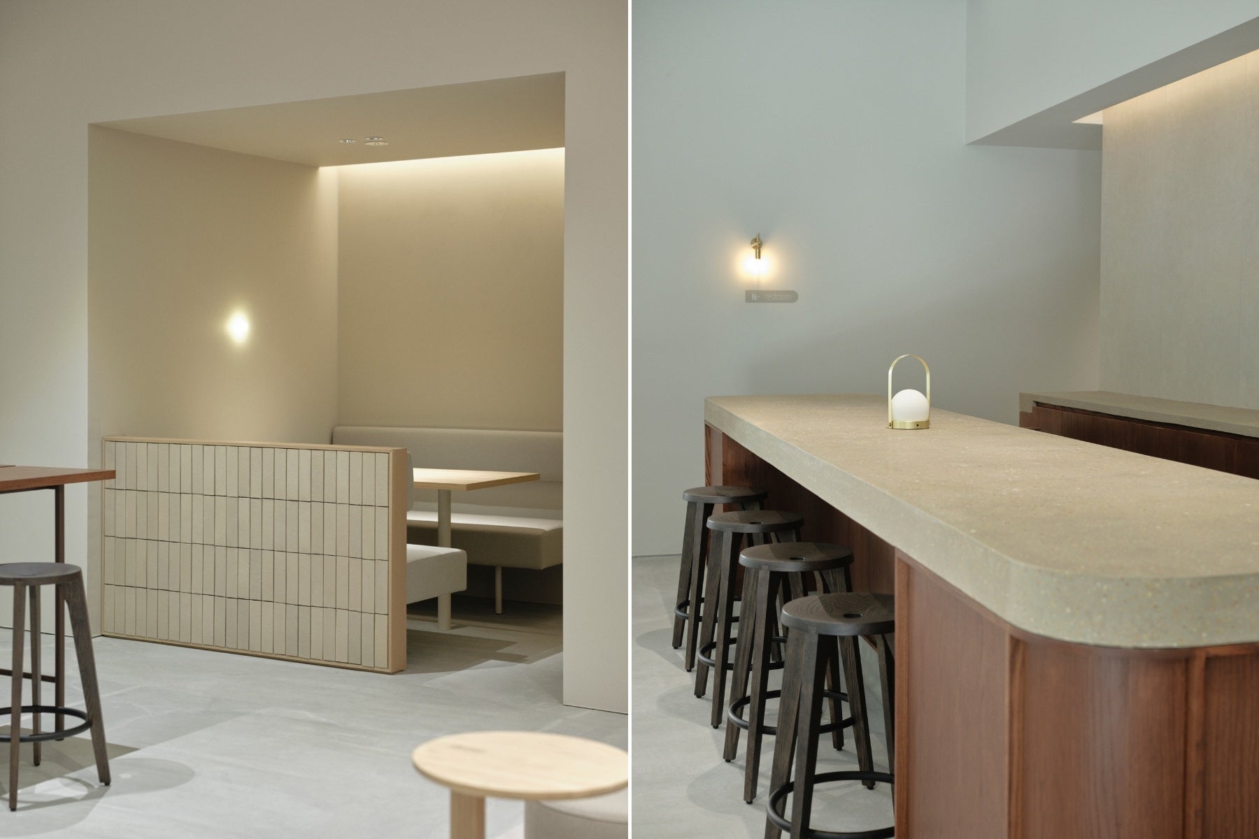 空間デザインはFLUU NKUU(フルーヌクー)が手掛けています。代表の古市翼氏は芦沢啓治建築設計事務所勤務を経て、貫井総子氏と2024年春に独立。日差しが差し込むテーブル席や、ゆったりと座れるソファなど、居心地の良い場所を見つけられるように構成されています。また、ライトグレーを基調としたシンプルな空間の中に、真鍮の照明やテラゾー、素焼きのブリック、オーク無垢材といった、作り手の温かみを感じられる素材が散りばめられています。