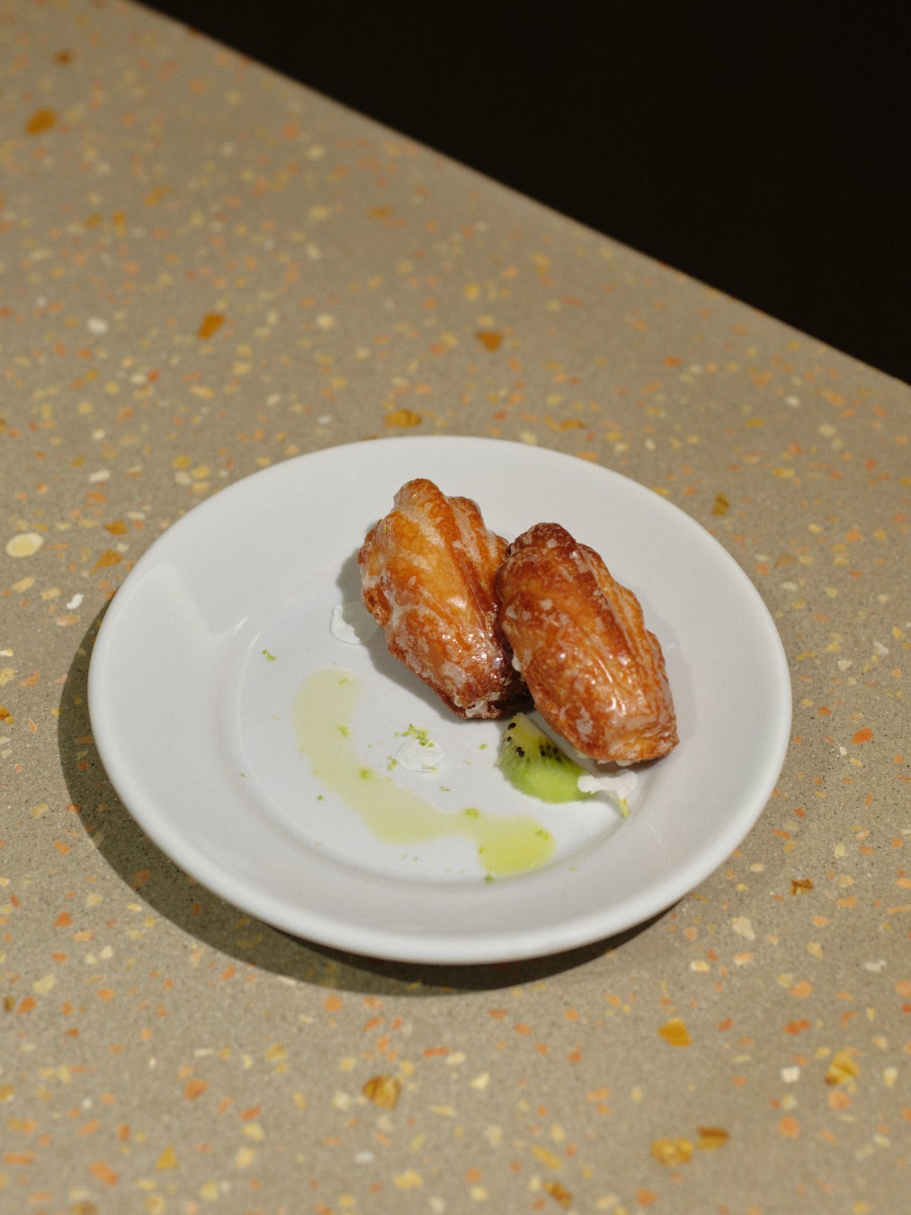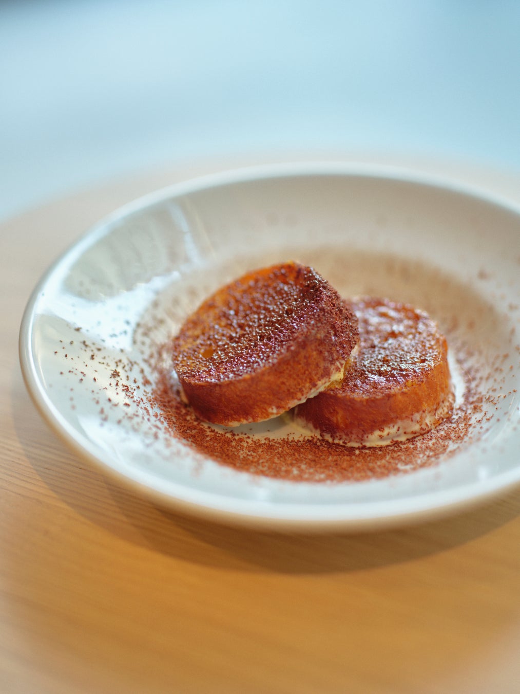 表面はカリッと焼き上げられ、一口頬張れば、中はとろとろ。軽やかな食感が広がります。仕上げに、オランダ発のクラフトチョコレートブランド「HEINDE & VERRE(ハインデ&ヴェレ)」の上質なダークチョコを散らすことで、ほのかなビター感が味わいに深みを加えています。