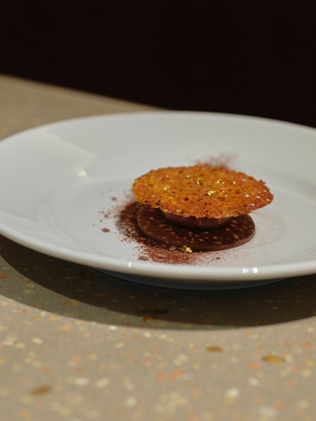 ビターなチョコレートの風味と、しっとりサクサクとしたタルト生地が織りなす絶妙な食感。上にはオレンジの爽やかな香りをまとったチュイール・ダンテルをあしらっています。仕上げにかけているチョコレートフレークの「スペキュラーズ ダーク」は、ほのかに香るスパイスの芳醇な香りが特徴で、どこか魅惑的な余韻を残します。