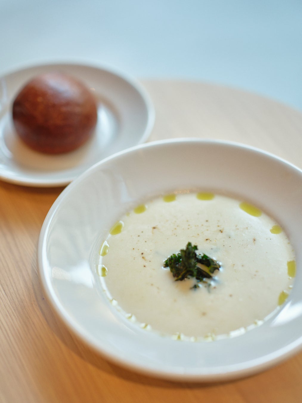旬の食材を使った体に優しいスープと自家製パンのセット。季節の恵みを存分に感じられるスープは、素材本来の旨味を引き出し、ほっとするような味わいに仕上げています。自家製の全粒粉パンには、香り豊かなハーブにほんのりガーリックを効かせたバターを添えています。