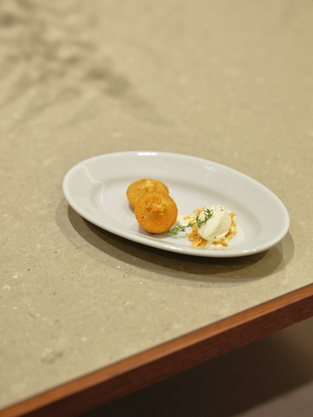 ヘーゼルナッツとアーモンドの香ばしさ、そして焦がしバターが織りなす深みのある味わいをお楽しみいただけるフィナンシェ。噛むたびにナッツの香りが広がり、贅沢な余韻を楽しめます。マダガスカル産ブルボンバニラビーンズを贅沢に使用した、クリーミーでリッチなバニラアイスを添えています。