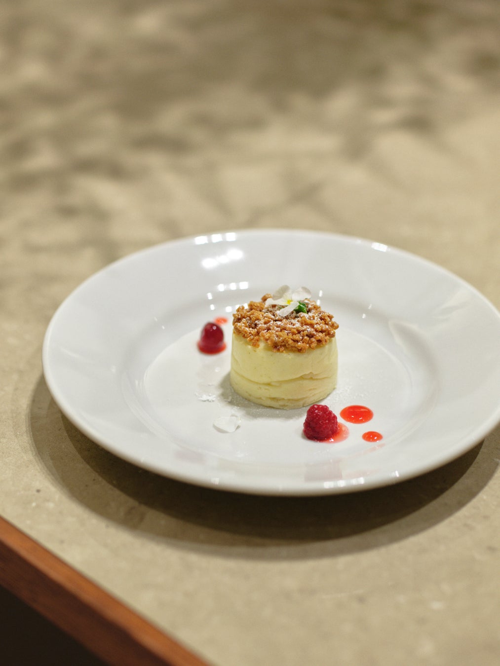 濃厚でなめらか、そして爽やかなチーズの香りが特徴です。レシピを開発するにあたりこだわったのは卵で、静岡県藤枝市の「山崎農園」のものを使用しています。「山崎農園」では、自然豊かな環境の中で平飼いの鶏を育て、鶏の健康と卵の品質管理を徹底しています。また、上に添えたシュトロイゼルが深みのあるコクを引き立て、ベリーソースが彩りと爽やかな酸味を添えています。