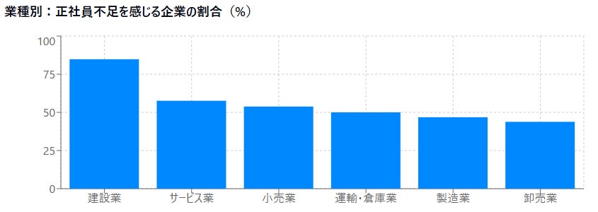 業種別の正社員不足状況では「建設業(84.8%)」が最も高く、8割を超える事業者が正社員の不足を自社課題と定義し、次点で「サービス業(57.6%)」「小売業(53.8%)」「運輸/倉庫業(50.0%)」「製造業(46.8%)」「卸売業(43.8%)」の順で続きます。