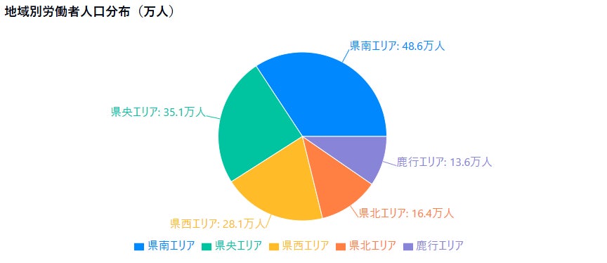上記2つのグラフは、茨城県における人材不足の実態と労働力分布を示していますが、特に建設業(84.8%)における人材不足の深刻さと、県南エリア(労働者人口約48.6万人)への労働力集中が特徴的です。