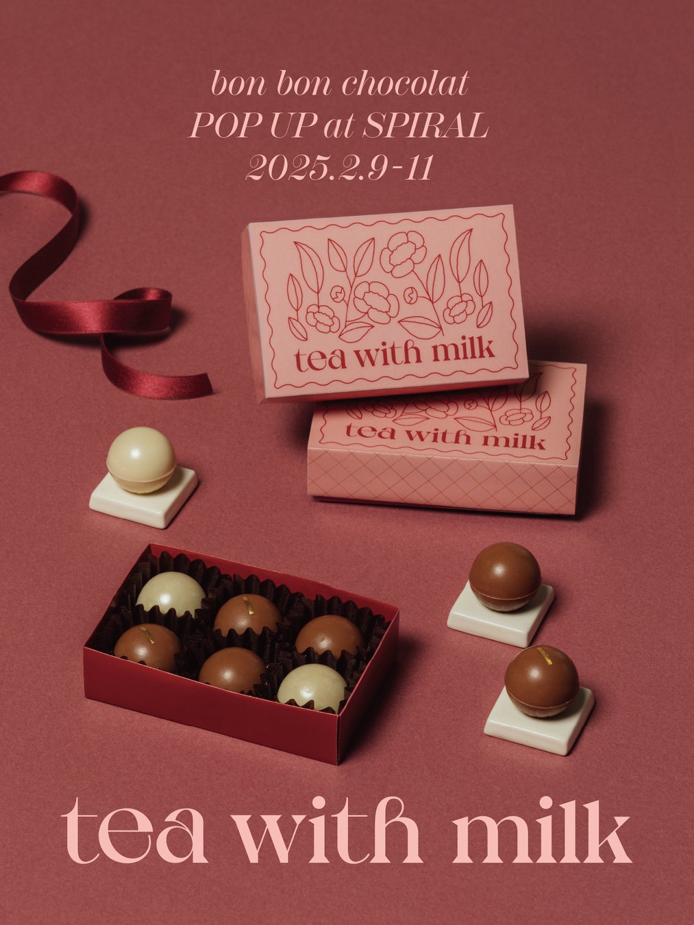 合同会社tea with milk(本社:東京都世田谷区/代表:土屋 きみ)が運営するミルクティー味のお菓子ブランド「tea with milk(ティーウィズミルク)」は、新商品「ミルクティーボンボンショコラ」の発売に合わせたイベント「bon bon chocolat POP UP at SPIRAL」を2025年2月9日(日)〜11日(火・祝)の3日間、表参道のSPIRALにて開催いたします。