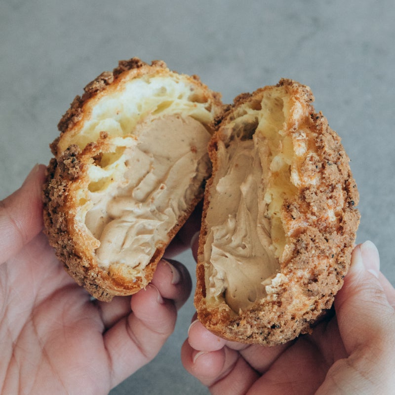 口当たりの軽いシューパフと、紅茶の茶葉を練り込んだザクザク食感のクッキー生地。二層になったシューの中に、たっぷりとクリームを詰め込みました。クリームには、香りの異なる二種類の茶葉をブレンドして使用。じっくりと時間をかけて生クリームに紅茶の香りをうつした後、ホイップしています。