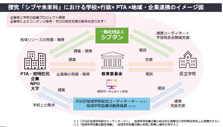 一般社団法人シブタン(シブヤ探究Lab 代表理事:山田 裕介)と渋谷区教育委員会(教育長:伊藤林太郎)とは、渋谷区教育大綱に掲げる「つくろう。ちがいを活かし合える、未来の学校。」の実現に向け、保護者、地域、企業等との連携促進・強化を図ることにより、児童・生徒の学びを街全体で支え、区立小学校及び中学校における”探究「シブヤ未来科」”の充実を図るため、以下のとおり連携協定を締結しました。