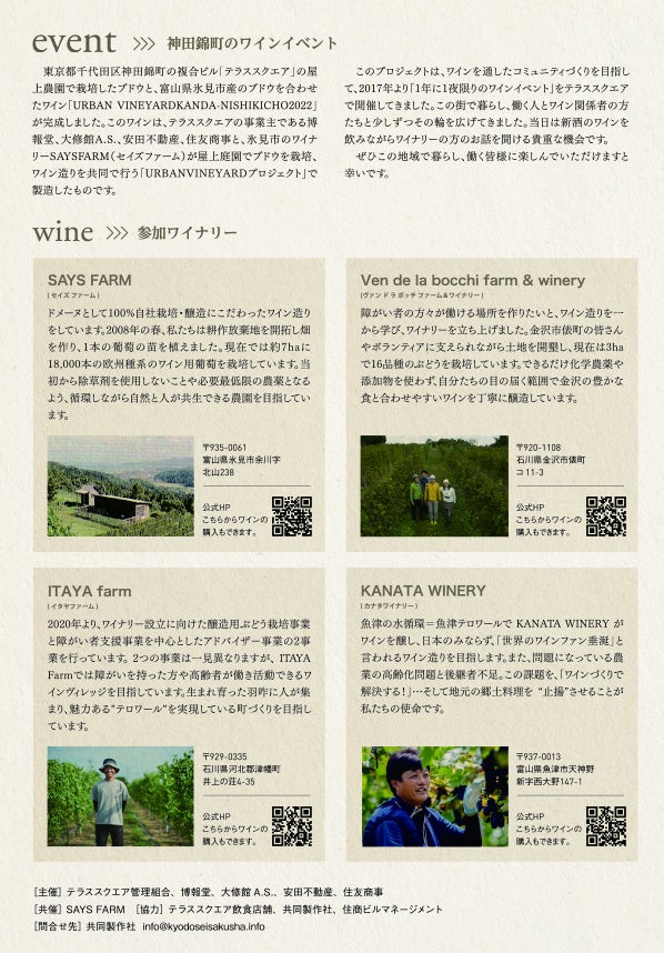 東京都千代⽥区神⽥錦町の複合ビル「テラススクエア」の屋上農園で栽培したブドウと、富⼭県氷⾒市産のブドウを合わせたワイン「URBAN VINEYARDKANDA-NISHIKICHO2022」が完成しました。このワインは、テラススクエアの事業主である博報堂、大修館A.S.、安田不動産、住友商事と、氷⾒市のワイナリーSAYSFARM(セイズファーム)が屋上庭園でブドウを栽培、ワイン造りを共同で⾏う「URBANVINEYARDプロジェクト」で製造したものです。