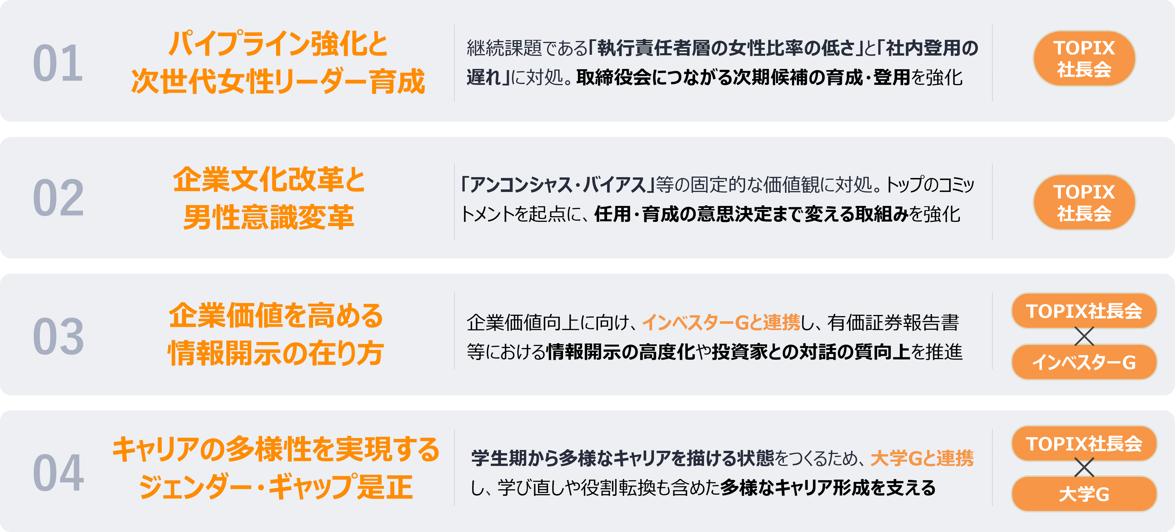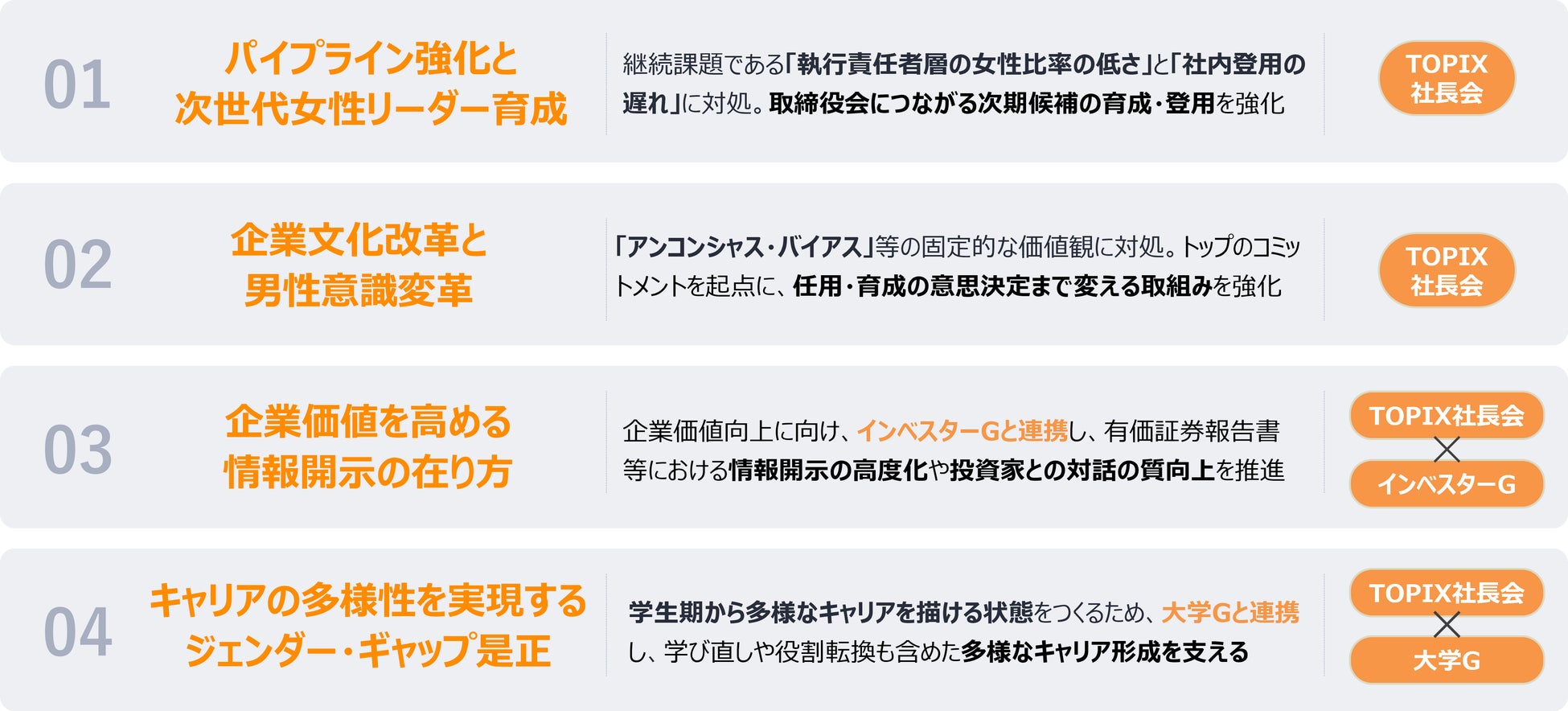 30% Club Japanは第3期活動において TOPIX100の取締役会に占める割合を30%以上とするという達成に向けた取り組みの加速とともに、「①パイプライン強化と次世代女性リーダー育成」、「②企業文化改革と男性意識変革」、「③企業価値を高める情報開示の在り方」、そして「④キャリアの多様性を実現するジェンダーギャップ是正」を新たに重点テーマとして掲げます。