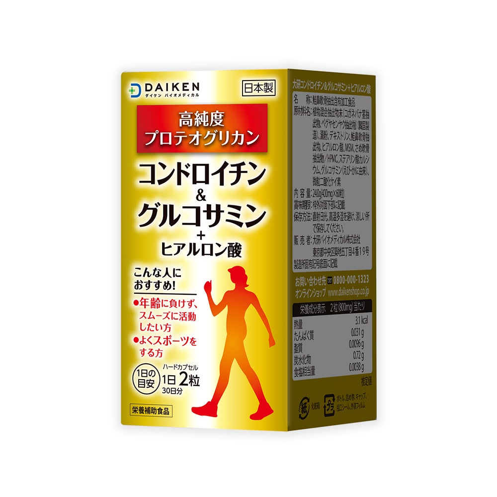 植物混合抽出物末(コガネバナ茎抽出物、ペグヤセンヤク抽出物)(韓国製造)、澱粉、デキストリン、鮭鼻軟骨抽出物、ヒアルロン酸、MSM、さめ軟骨抽出物/HPMC、ステアリン酸カルシウム、グルコサミン(えび・かに由来)、微粒二酸化ケイ素