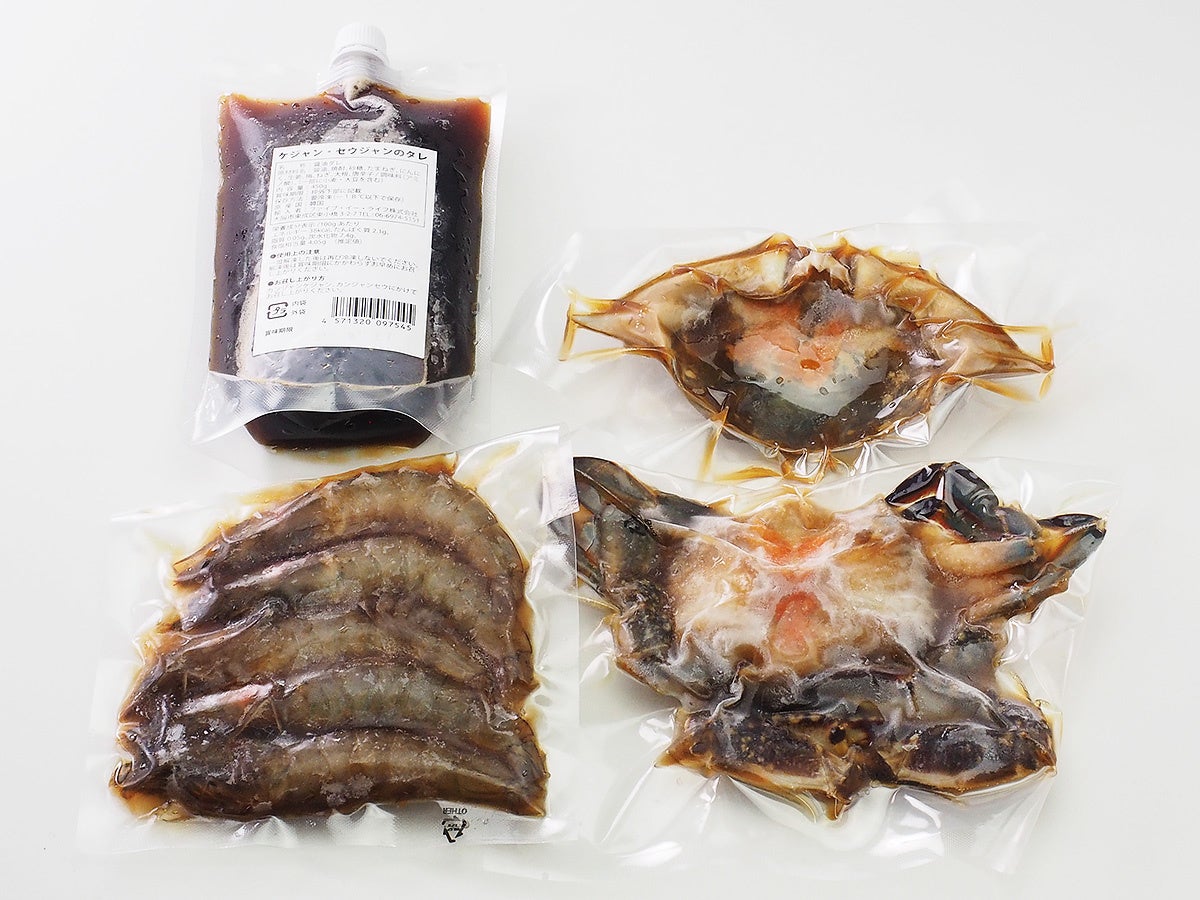 セット内容:ワタリガニの醤油漬け(カニ1杯約320g)、セウジャン(シロアシエビ5尾)180g、ソース200g×1