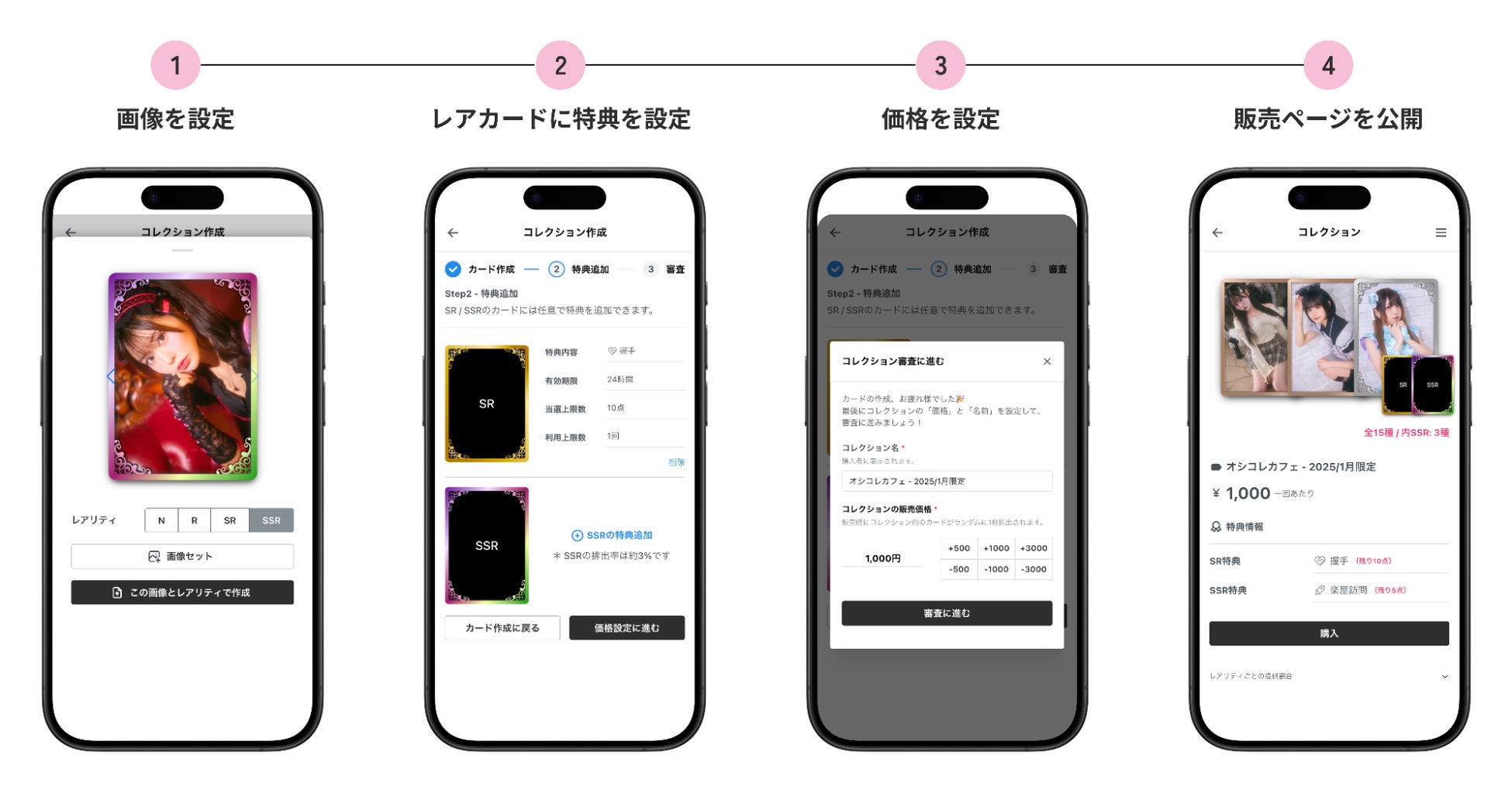 販売は、9枚1セット(コレクション)のガチャ方式です。SRカード、SSRカードに「握手」や「楽屋訪問」などの特典を設定します。