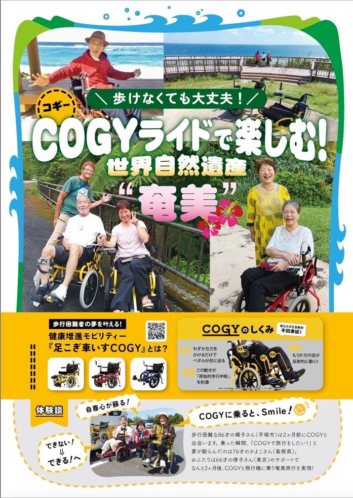 シニア層や足が不自由な方向けの次世代型モビリティ「COGY」を活用することで移動の負担を大幅に軽減しながら、「自分で動く楽しさ」を体験いただけるのが特徴です。体力や足腰の調子に不安があり、旅行を控えていた方にこそおすすめしたいプログラムとなっております。この機会にぜひ、”東洋のガラパゴス”とも称されるどこか懐かしさを感じさせる奄美大島の豊かな自然や文化を家族や気の置けない仲間たちとお楽しみください。