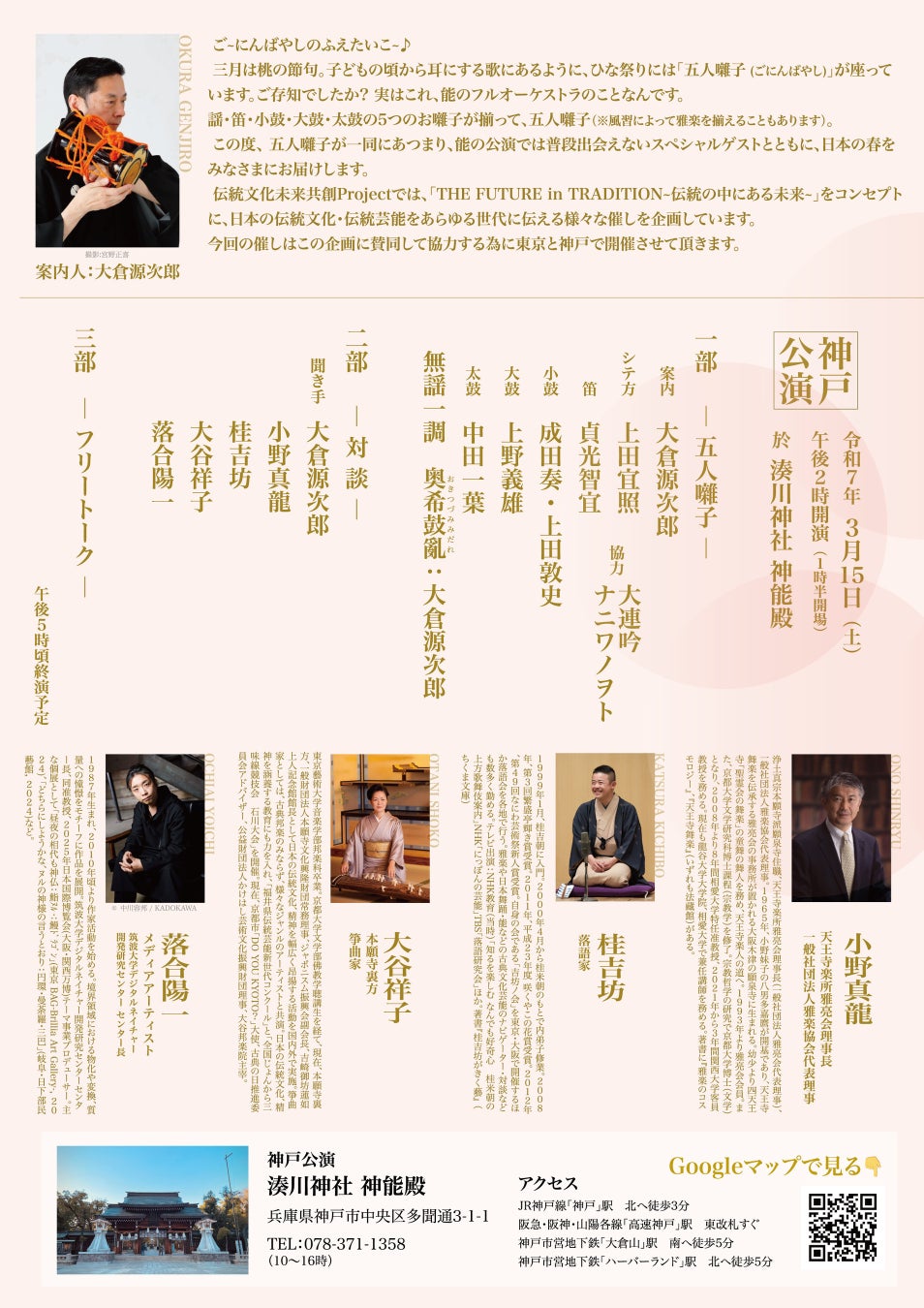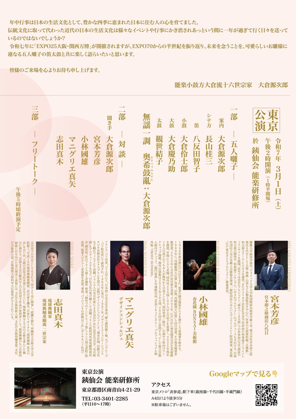 2025年に「EXPO25大阪・関西万博」の開催に伴い、前回の大阪万博であるEXPO70からの半世紀を振り返り、未来へ念うことを、可愛らしいお雛様に連なる五人囃子の笛太鼓と共に楽しく語らいたいと思います。様々なジャンルの伝統文化の未来を担う方々と共に、100年、1000年続いてきた日本の伝統文化から学び、これからの未来につなげる会。案内人:大倉源次郎が賛同者として名を連ねる伝統文化未来共創Projectでは、「THE FUTURE in TRADITION~伝統の中にある未来~」をコンセプトに、EXPO25大阪・関西万博において、2025年6月3日から8日まで日本の伝統文化・伝統芸能を世界のあらゆる世代へ伝える様々な催しを企画しています。今回の催しは、この6月のプロジェクトに向けた賛同の協力として開催させていただきます。