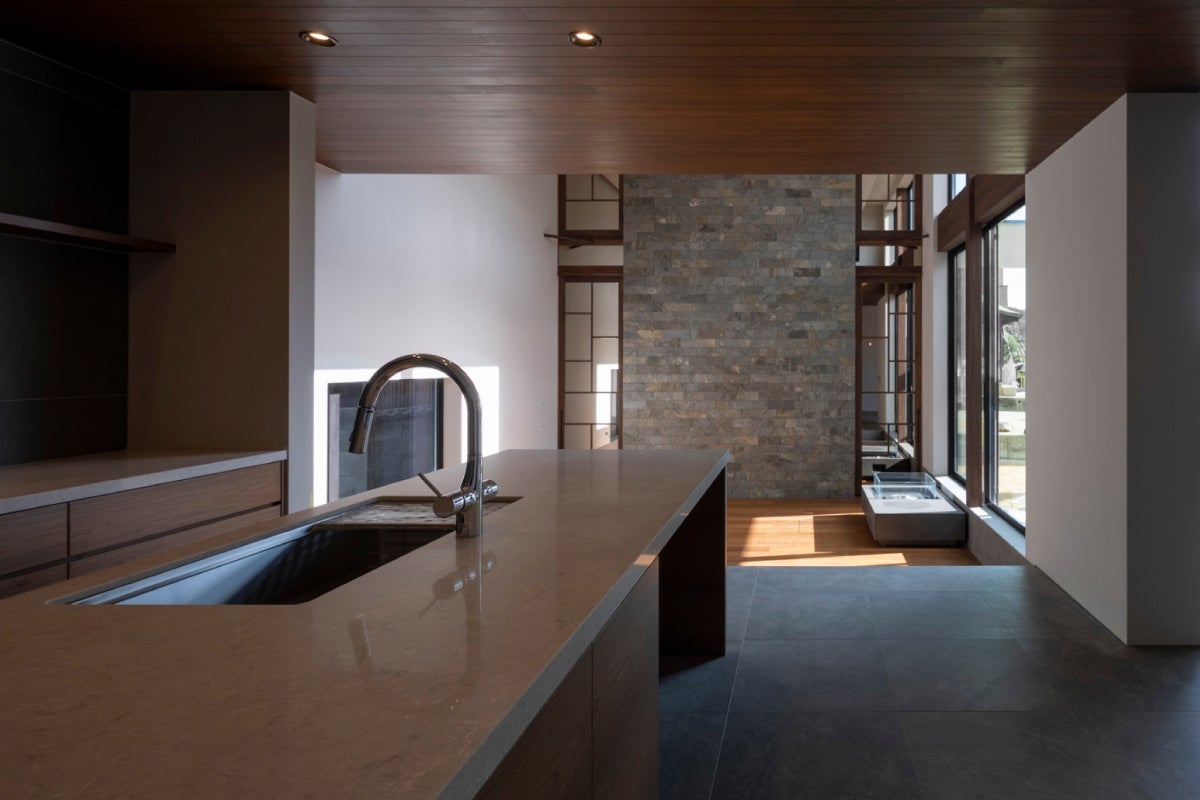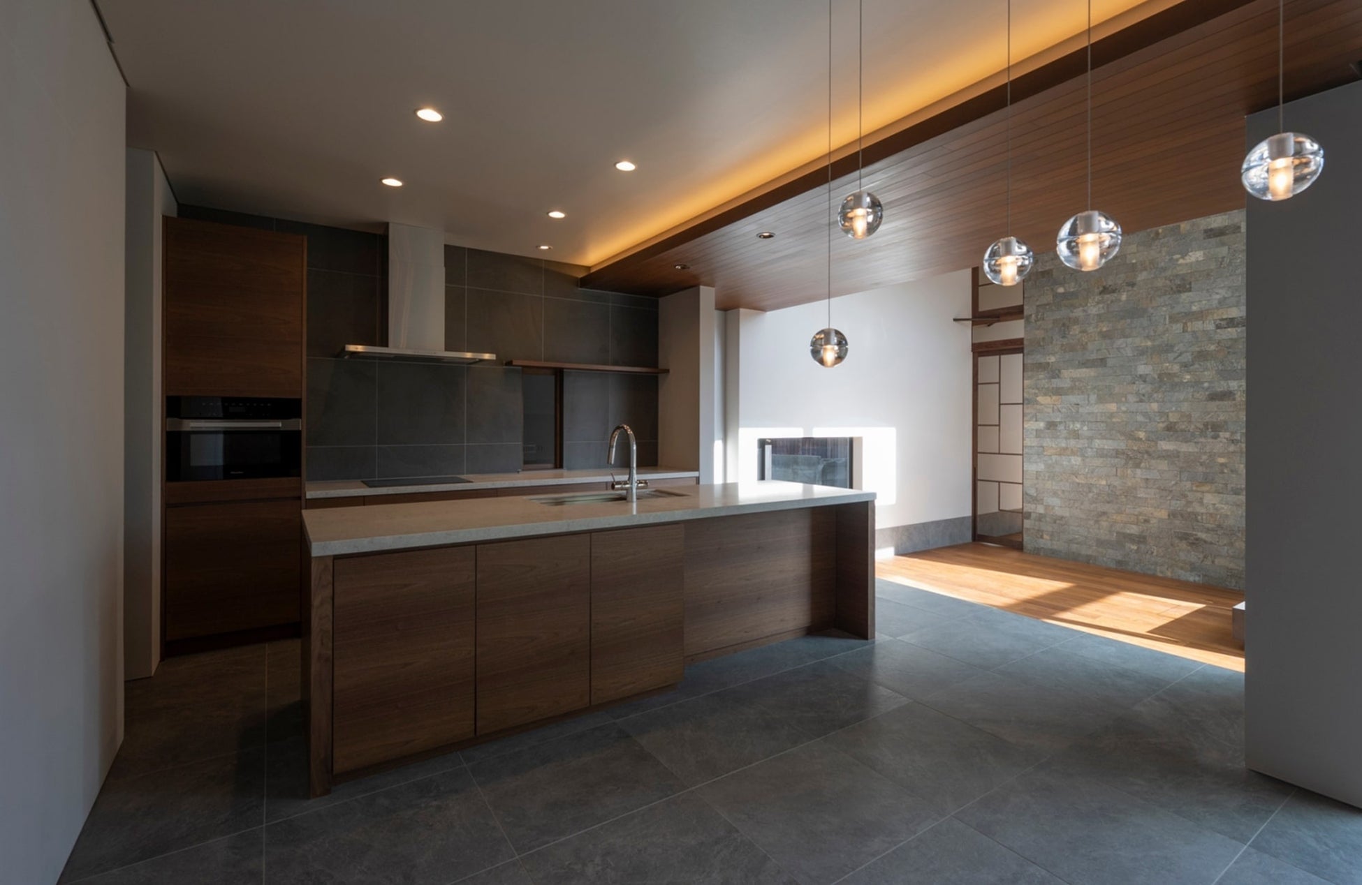 「時を超えて紡がれる家」は、お施主様のライフスタイルを第一に考え、個の空間はシンプルに保ちつつ、家族が集まる空間には厳選された自然素材を使用し、心地のよい質感を感じさせるしつらえにしています。暖炉の温かな炎、窓から差し込む自然光、中庭からの風、そして四季折々の植栽の変化が、家族のコミュニケーションの場をより豊かなものにしています。またプライバシーを重視し、インナーガレージや建物中央に配置された中庭など、安心と快適さを兼ね備えた住まいとなっています。