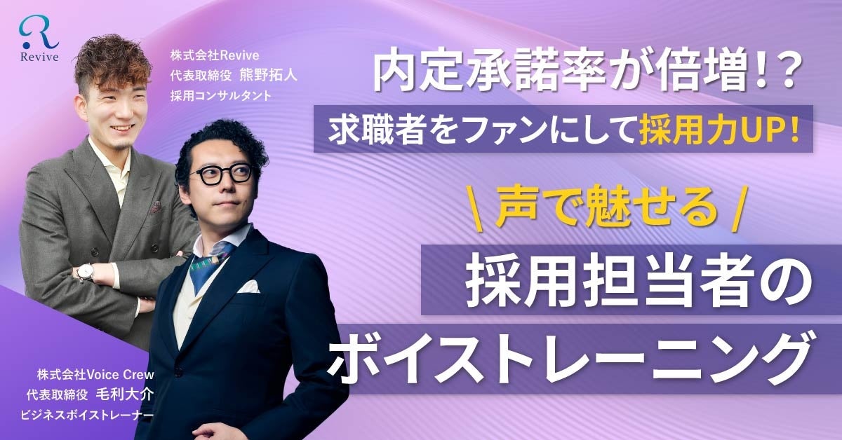 中小企業を対象に「採用活動におけるあたりまえを、あたりまえに徹底する」をテーマに掲げ、煩雑でコストのかかる採用活動を社員一名分よりも低コストで採用のプロが支援する株式会社Revive(リバイブ)[本社:東京都中央区、代表取締役社長:熊野 拓人]は、求職者をファンにして採用力UP!声で魅せる『採用担当者のボイストレーニング』セミナーを開催します。