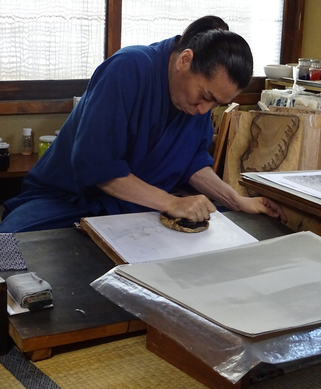 彫師、摺師、材料や道具を作る工房それぞれが江戸時代からの技術と手法を継承し、版木は山桜、和紙は「越前生漉奉書紙」を使用した伝統工芸品です。