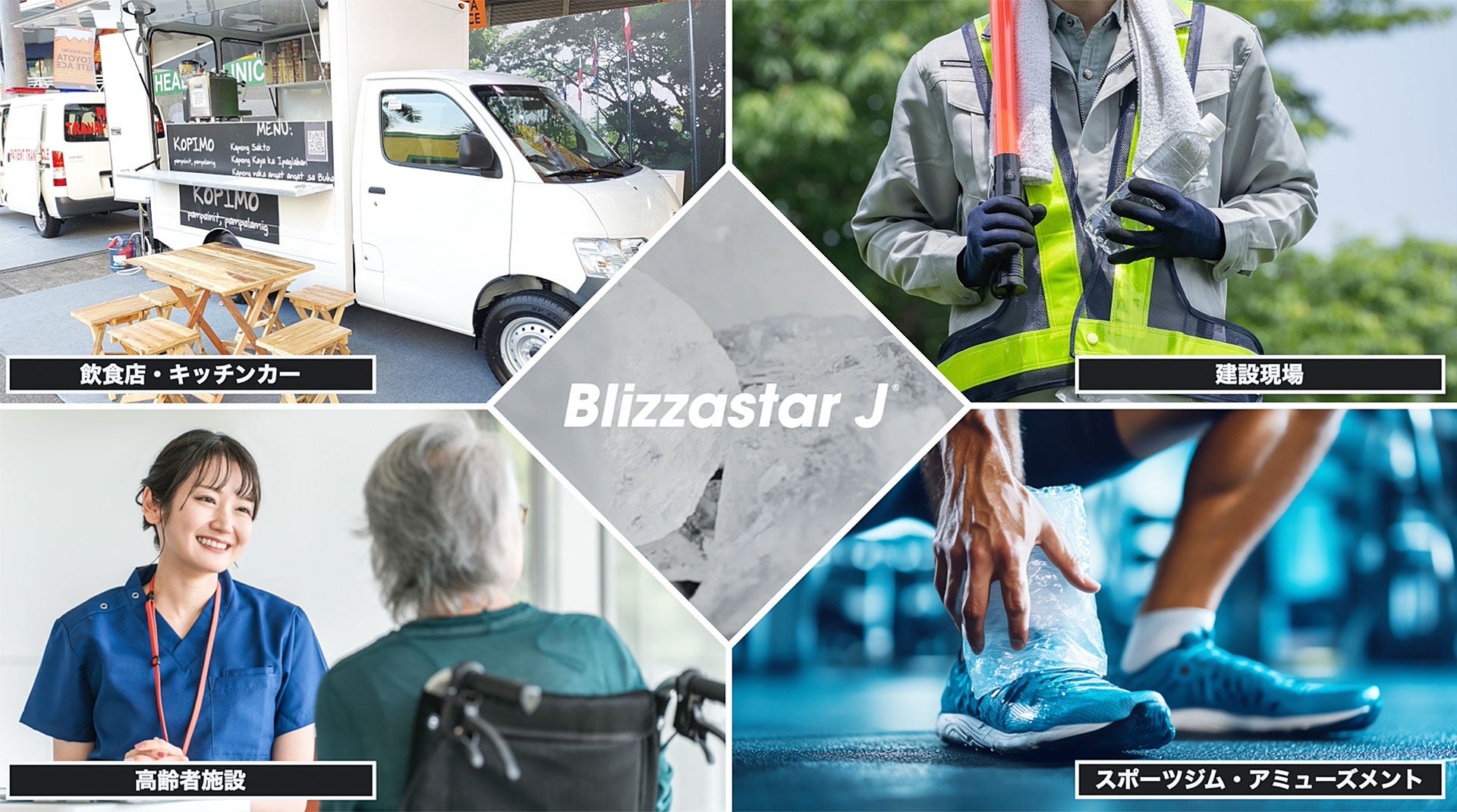「Blizzastar J®」は、業界最小・最軽量・静音のコンパクト設計(幅321×奥行き501×高さ381mm、重量37kg)で、家庭用電源(100V)やポータブル発電機でも稼働でき、給水工事も不要、ペットボトルの水・ジュース・経口補水液・出汁・アルコールなどの多種の飲料をそのまま氷に変えるというユニークな機能を備えています。