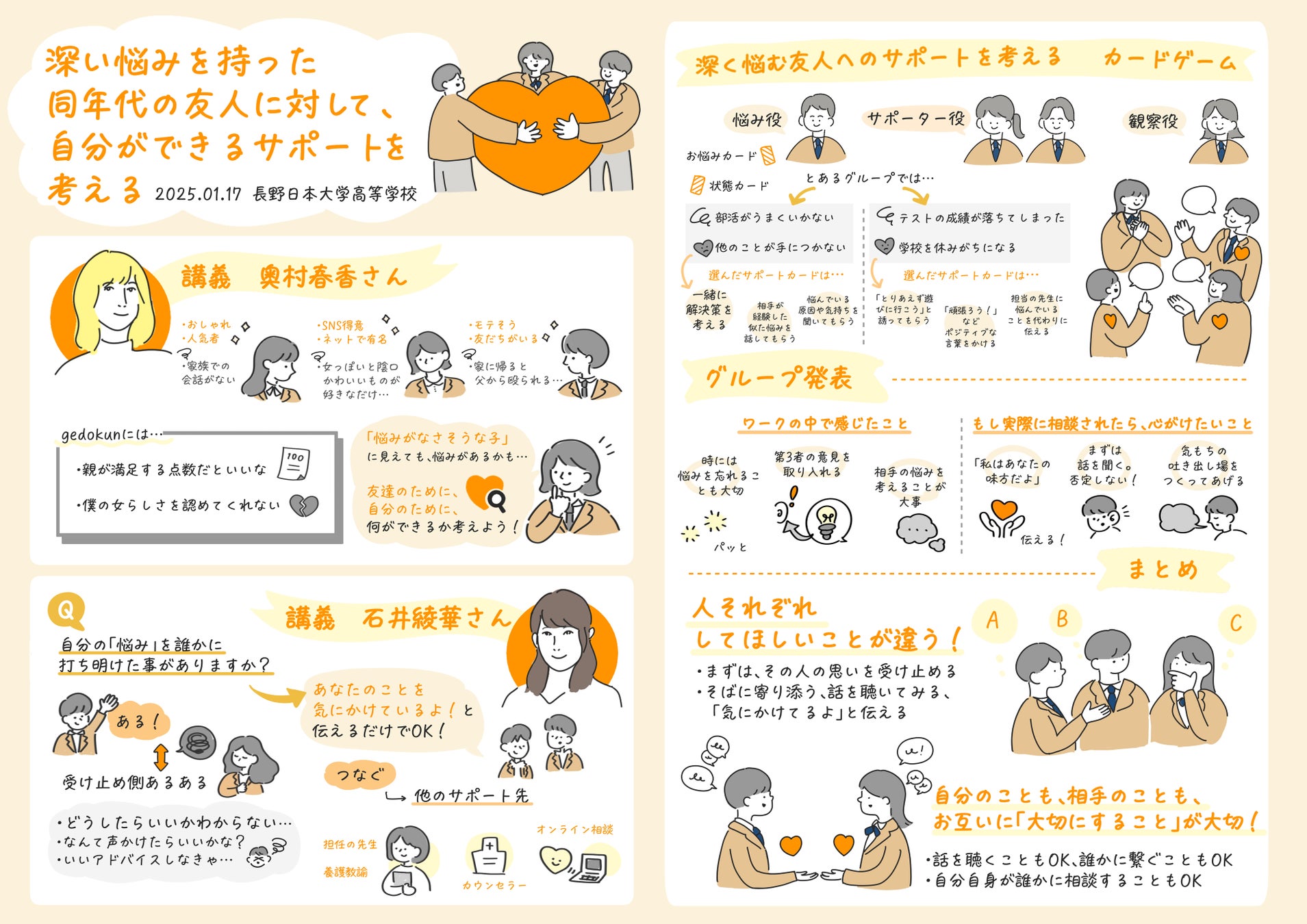 本ワークショップは、自殺につながるような深刻な悩みについて学び、悩みを持つ友人にどのようなサポートができるかを理解することを目的に、長野日本大学高等学校の探求創造学科1年生34名に対して実施しました。