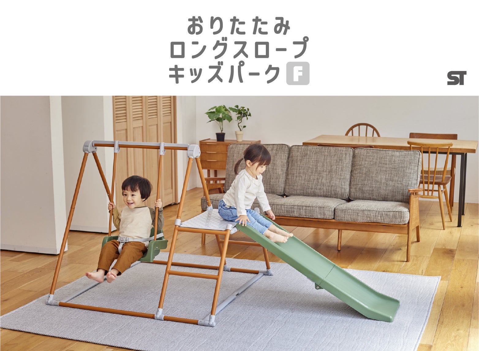 雨や猛暑などであまり公園に連れて行ってあげられないといった悩みに加え、最近はインテリアにこだわる子育て世代も多く、従来の遊具ベースの室内遊具では満足できない層に向けて出来るだけおしゃれで家具ライクな遊具を目指しました。プラスチックを無くす事はできませんが最小限に留めて家具などに使われているスチールをメイン素材に設計する事で、遊具と家具の両立を図っています。長さ110cmのすべり台にブランコ付き、それでいてお部屋で圧迫感のない全体的にボリュームを抑えたシンプル&すっきりデザインです。しかも設置面積は約1.5畳の省スペース!
