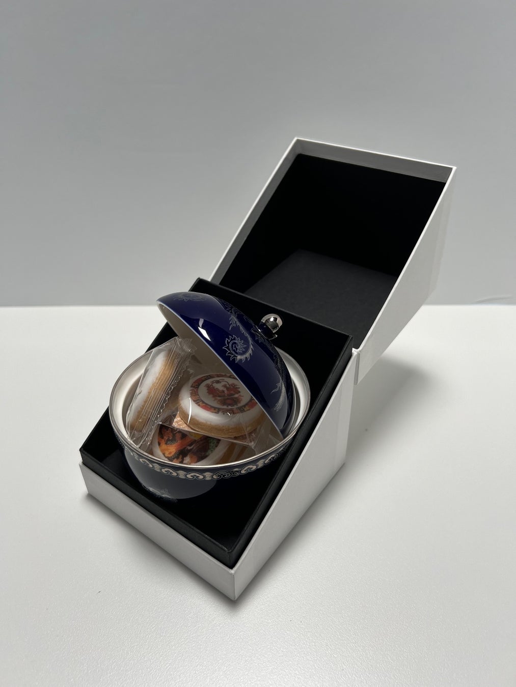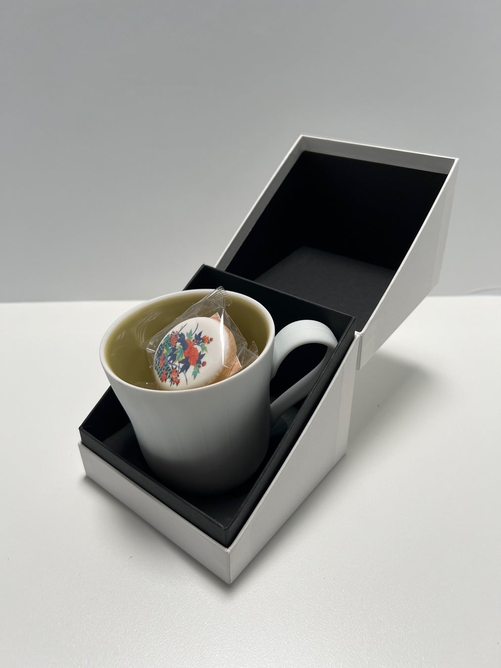 大型の方は白磁彩菓 9 種セレクトとカップ&ソーサー、コンパクトなパッケージは白磁彩菓5個とボンボニエールまたはマグカップを一緒に販売します。