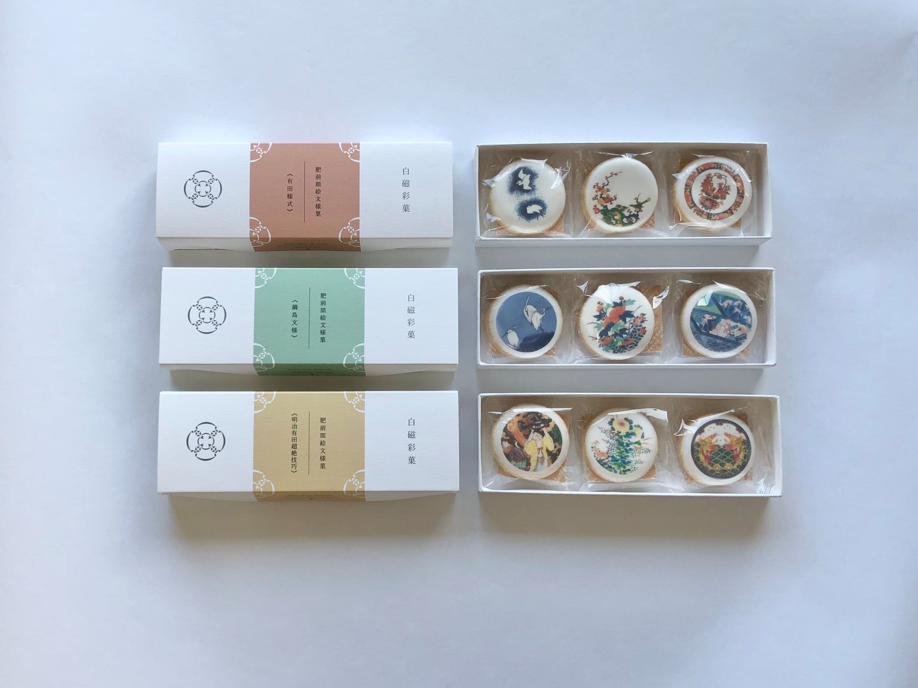 2019年11月第一弾となる「白磁彩菓 肥前皿絵文様菓 有田様式」(5個箱入り2,200円税込)を一般販売開始し、以降5年間で「鍋島文様」「明治有田超絶技巧」の2シリーズを追加、全3シリーズ合計15種類の絵柄があります。パッケージはこれまでお土産品として5個入り、3個入り(1,300円税込)、個包装(400円税込)を発売。2024年より贈答用として9個入り(4,000円税込)、15個入り(6,480円税込)を増やしてお客様の様々な活用シーンに応える商品展開を図っています。