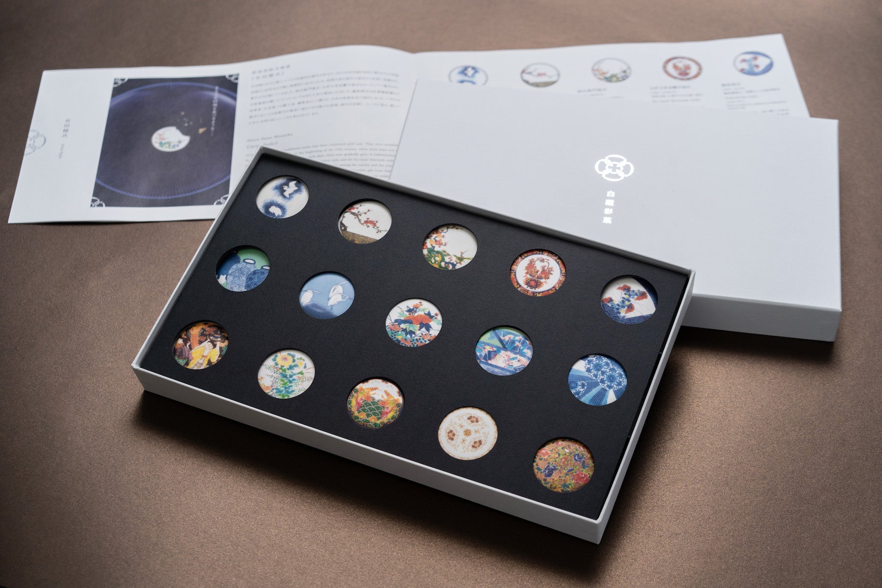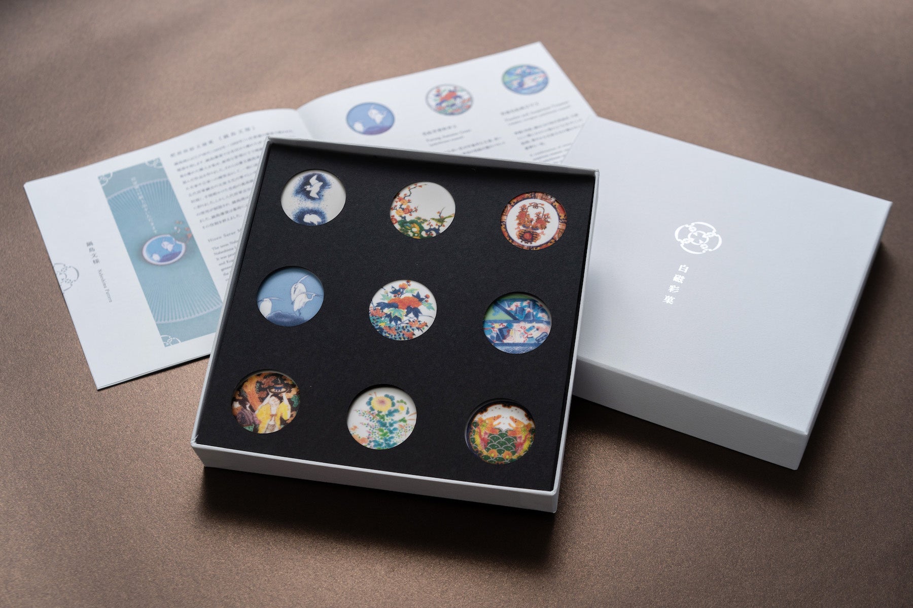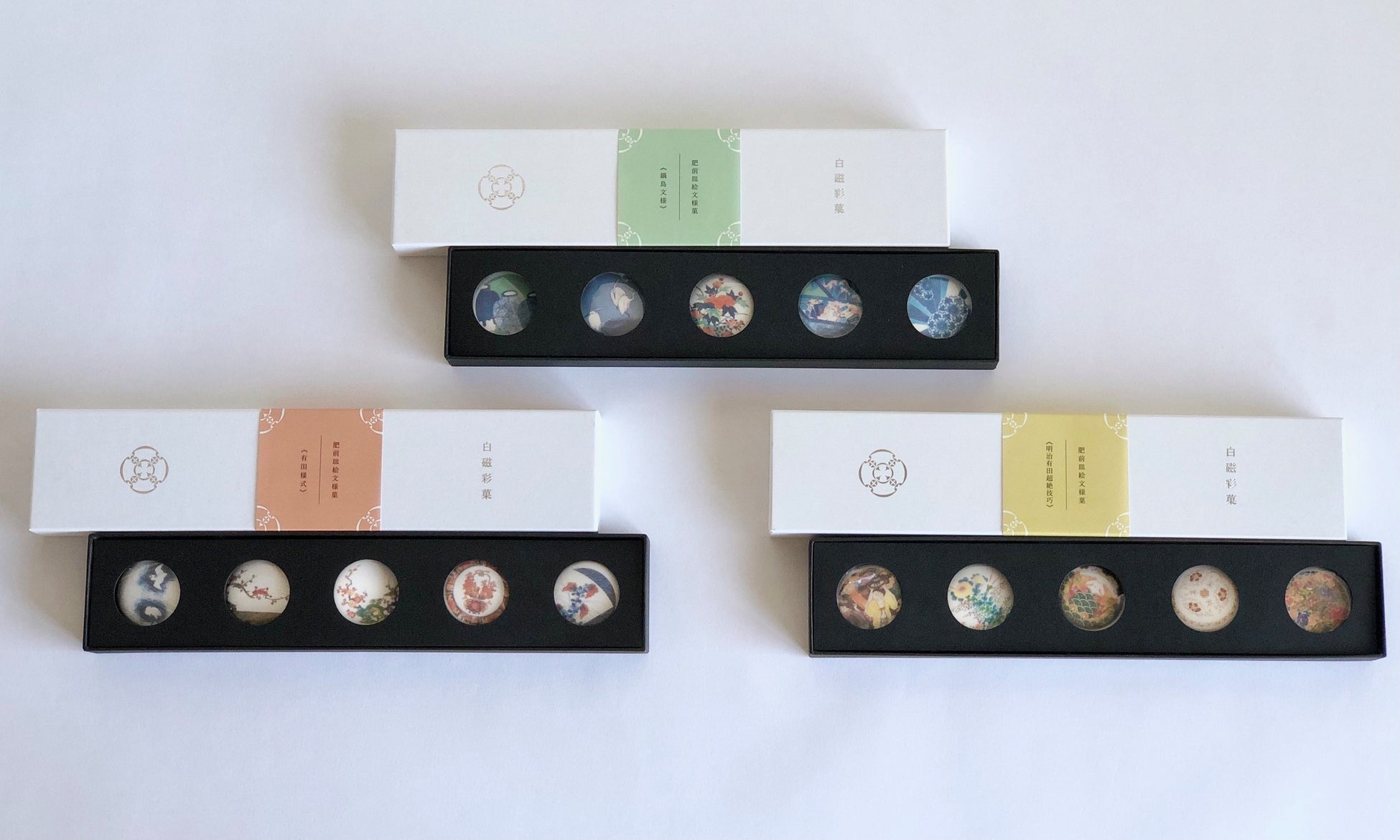 白磁彩菓全15種セット、9種セレクトは白磁彩菓の3シリーズ「有田様式」「鍋島文様」「明治有田超絶技巧」の絵柄を ひとつの箱に全て詰め込んだ贅沢なセットです。有田焼の創成期から明治期までを一度にお楽しみいただけます。