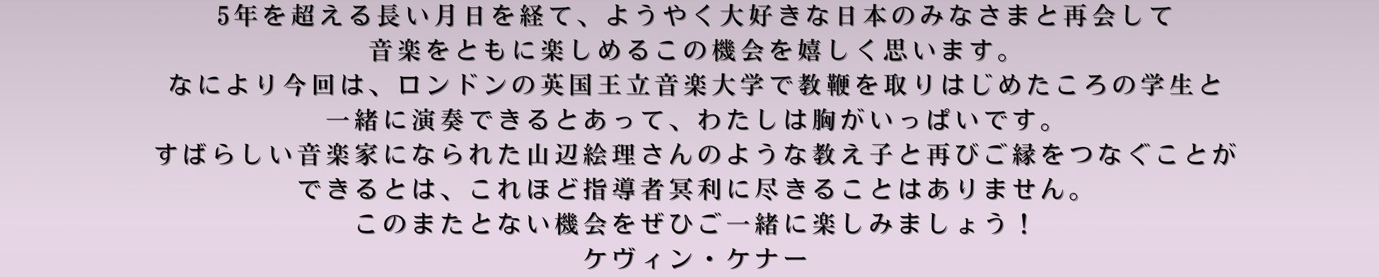 ケナーは1997年に横浜市招待国際ピアノ演奏会に出演して以来、横浜をはじめ日本各地で公演を重ねてきました。しかし、近年は日本での演奏の機会がなく、今回は実に5年ぶりの日本公演となります。彼の来日を待ち望んでいた方、山辺の演奏を楽しみにしてくださっている方はもちろん、ピアノデュオの魅力を体感したいすべての方へ。珠玉のひとときをお届けします。