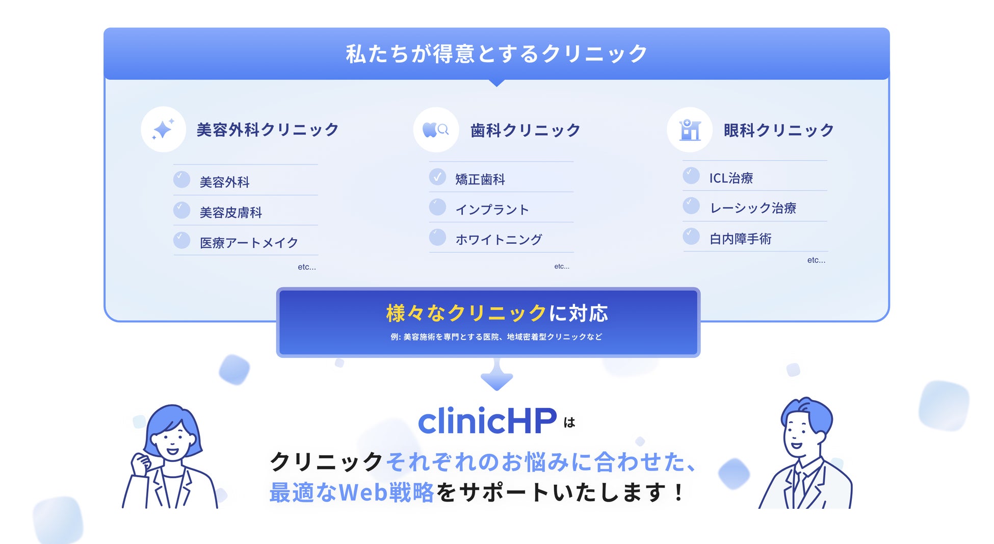clinicHPは、美容クリニック・歯科・眼科など、さまざまな医療機関向けに特化したホームページ制作を行います。豊富な実績と医療業界の知識を活かし、患者にとってわかりやすく、使いやすい設計を採用。