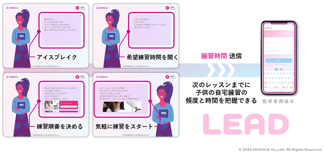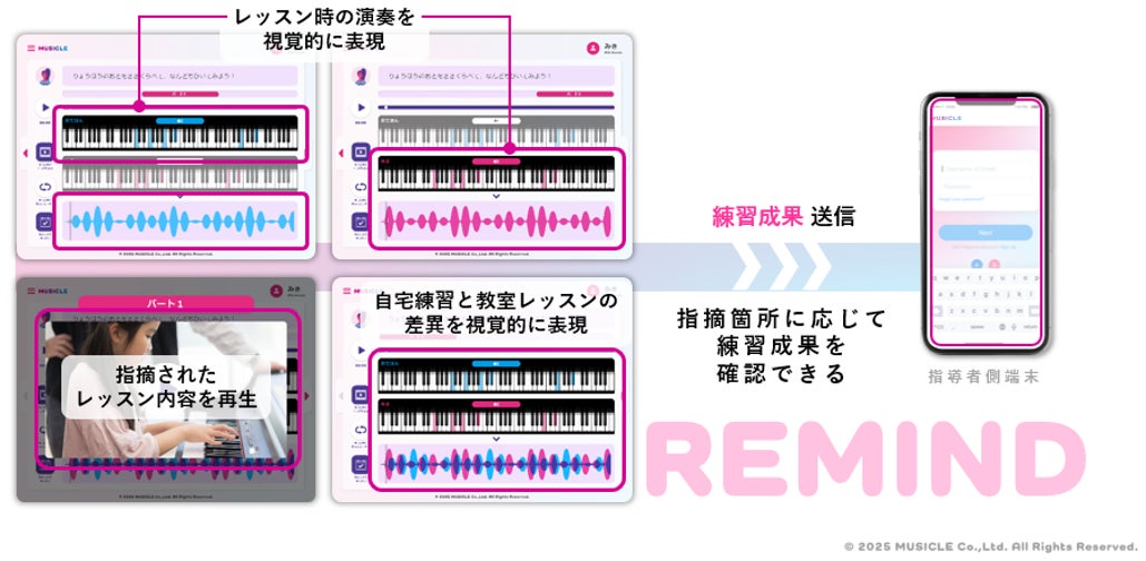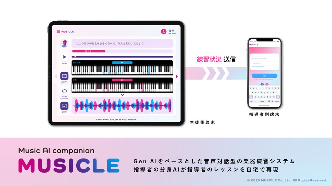 MUSICLEは、生徒の自宅練習をサポートしながら、教師の負担を軽減し、より効果的なレッスンの継続を実現するために、生徒向けアプリと指導者向けアプリを同時に提供します。