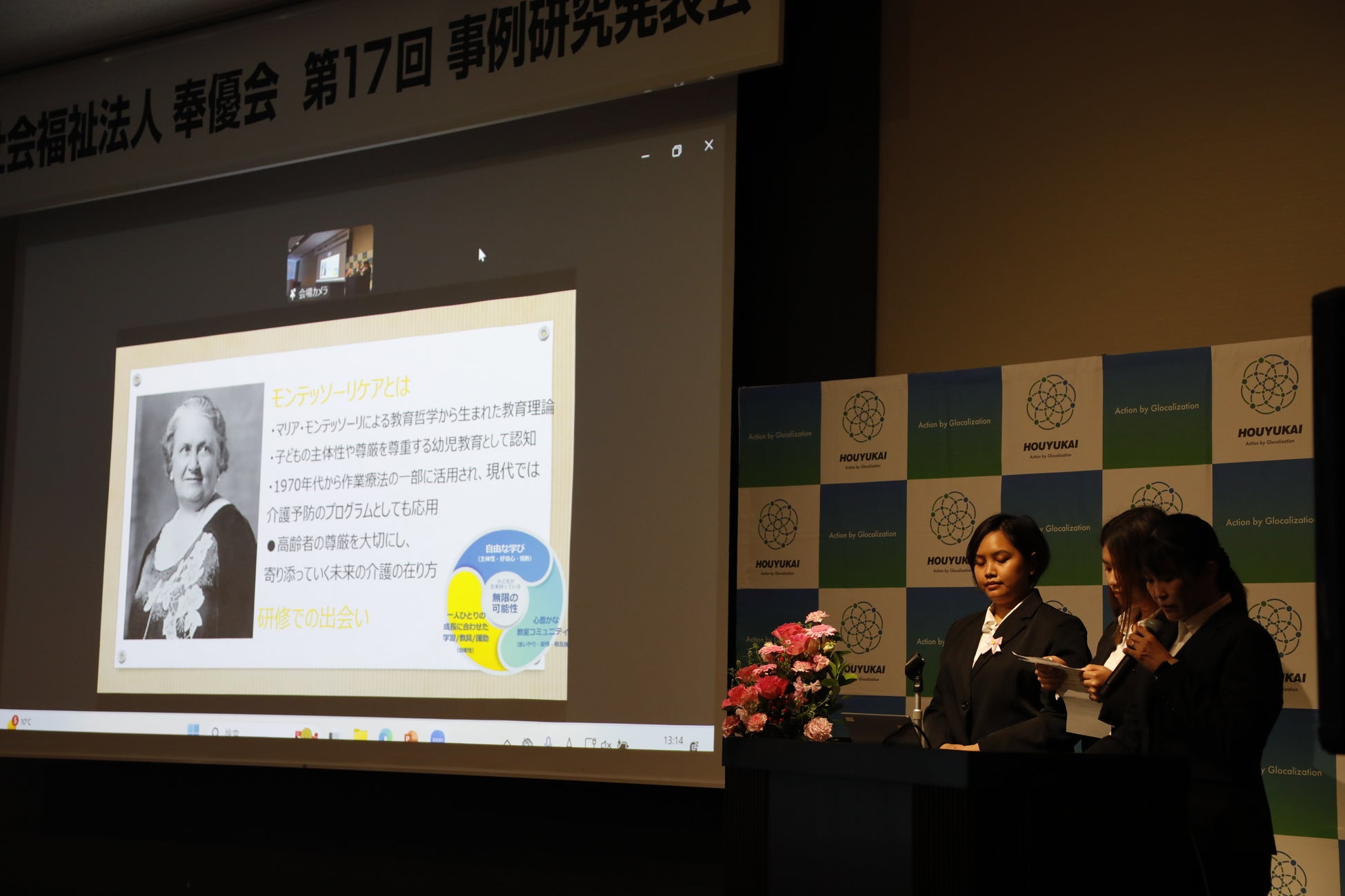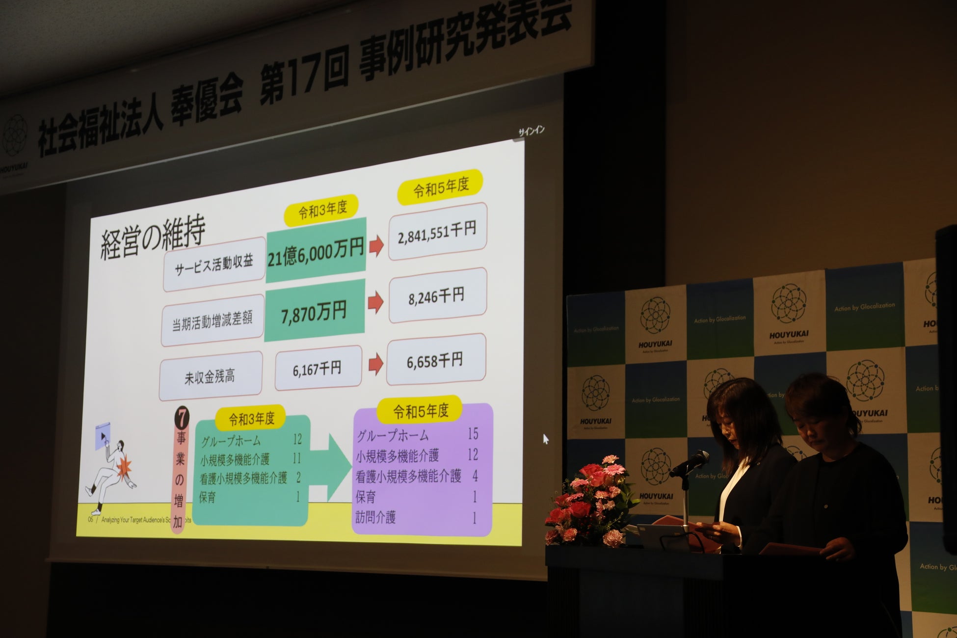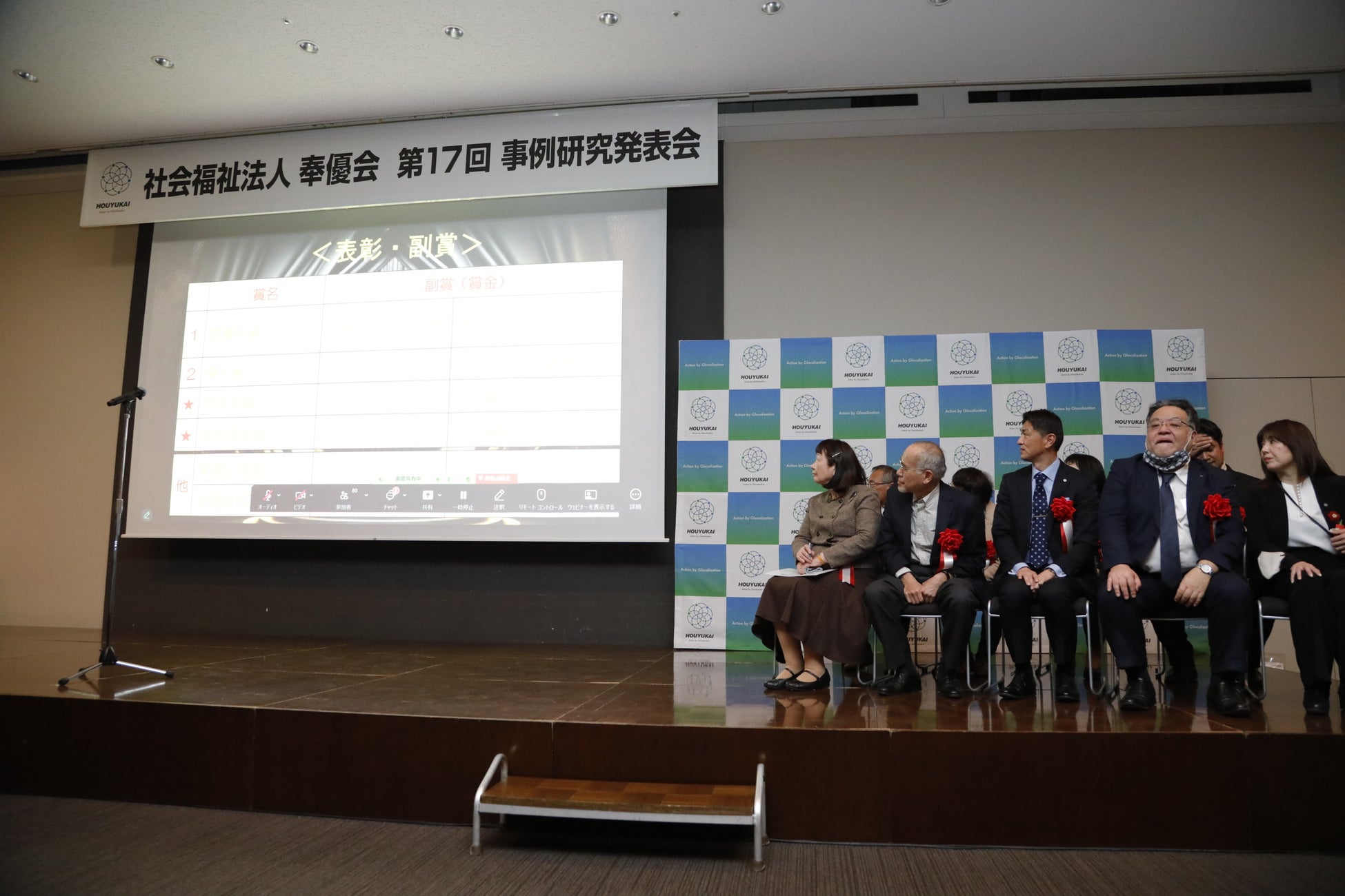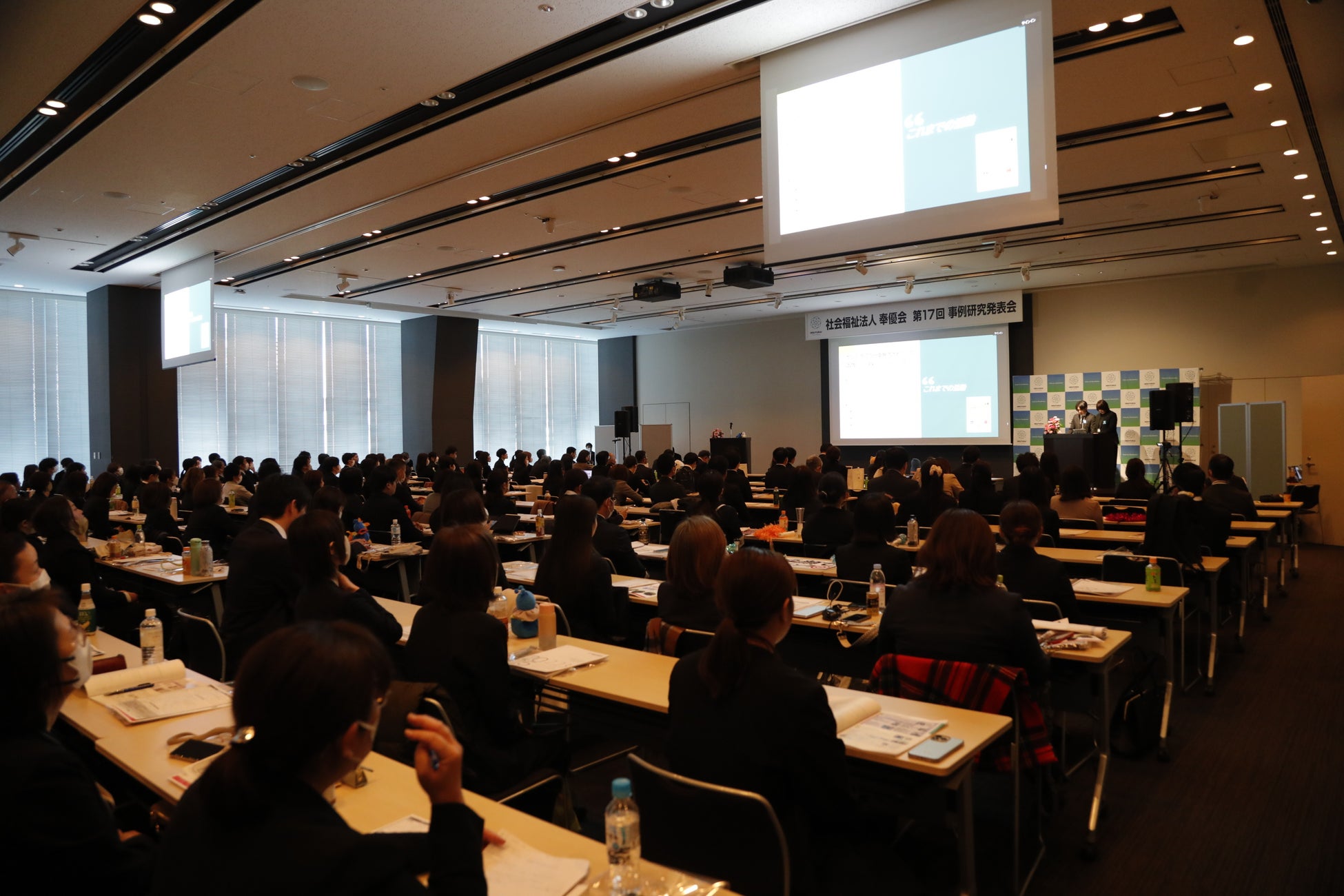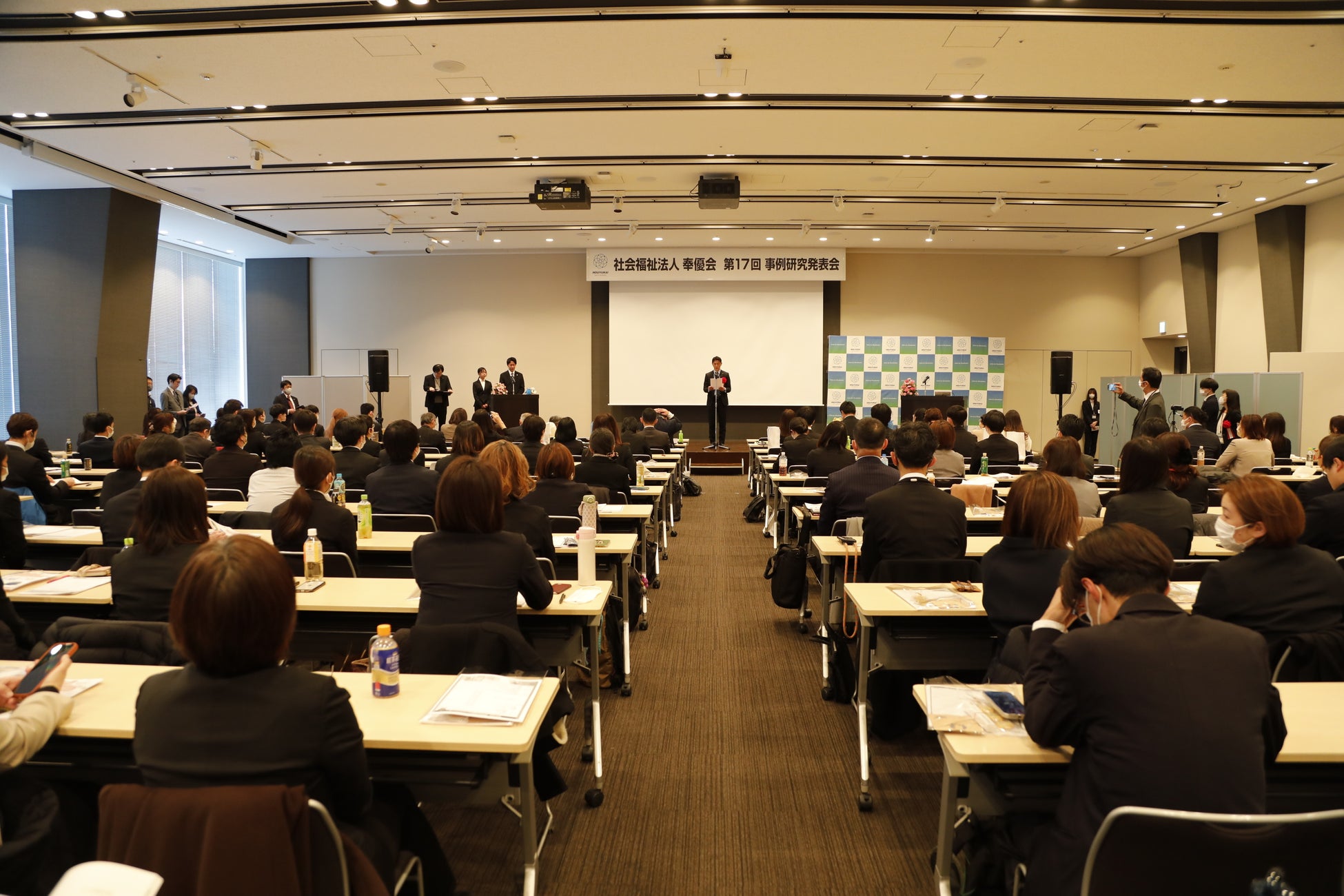 福祉現場の知見を体系的に蓄積し、サービスの質の向上と持続可能な組織運営を実現するとともに、人材の育成や技術の向上、福祉価値の創造を目的としています。また、各事業所の取り組みを共有することで、法人全体の発展を促し、地域福祉の成長に貢献することを目指しています。今年度は会場とオンライン(Zoom)を併用したハイブリッド開催となり、418名の参加者にご視聴いただきました。