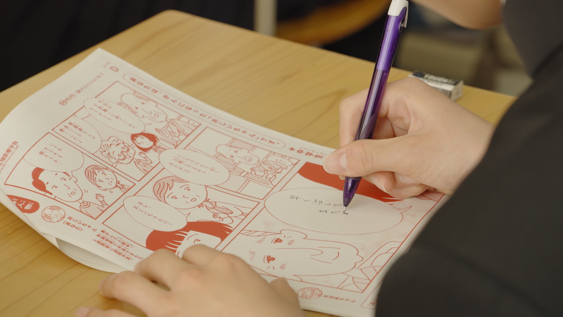日本人の2人に1人、つまり誰もががんになりうる時代だからこそ、がんになることを自分事(自分の日常に起こりうること)として捉えてもらえるよう、中学生にとって極めて身近な「マンガ」をベースにした『未完成マンガ』を開発しました。「がんに罹患している登場人物=自分」という仮定のもと、がんになった人物になりきって自分の心の中を想像し、相手に「かけられたい言葉」を考え、セリフとして言語化してもらうワークです。