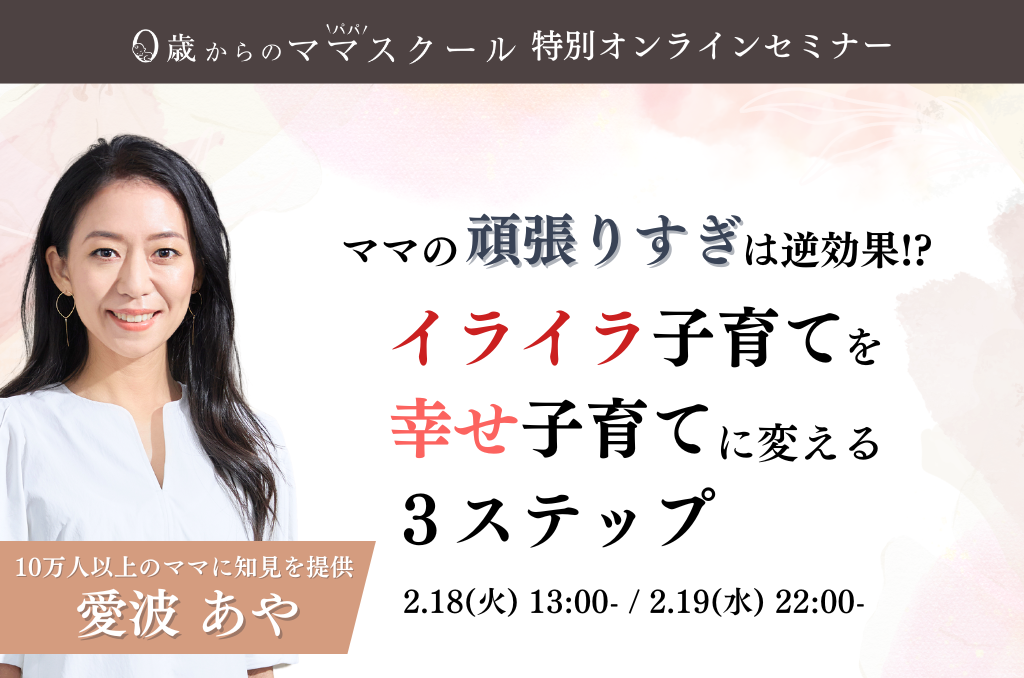 「0歳からのママスクール®」(代表:小沼もか)は2025年2月18日(火)13時、2月19日(水)22時に0~3歳の親向けに「イライラ子育てを幸せ子育てに変える3ステップ」を解説する無料オンラインセミナーを開催します。0歳からのママスクール® 「ママの心」講座監修・講師を務めるSleeping Smart Japan株式会社代表・愛波あやが、幼少期の育児で母親が陥りやすい寝不足・完璧主義・虚無感への対処法を解説いたします。