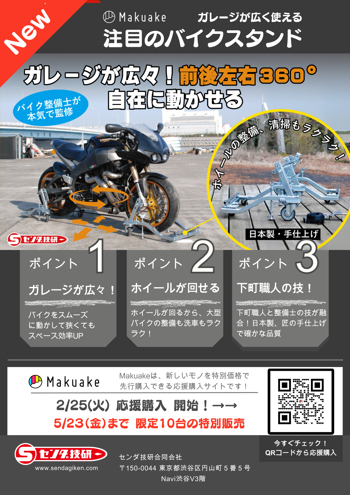 センダ技研合同会社(東京都渋谷区、代表:千田明生)は、バイク整備の効率を大幅に向上させる「匠の手仕上げスタンド360」を開発。2025年2月25日よりMakuakeにてクラウドファンディングを開始します。
