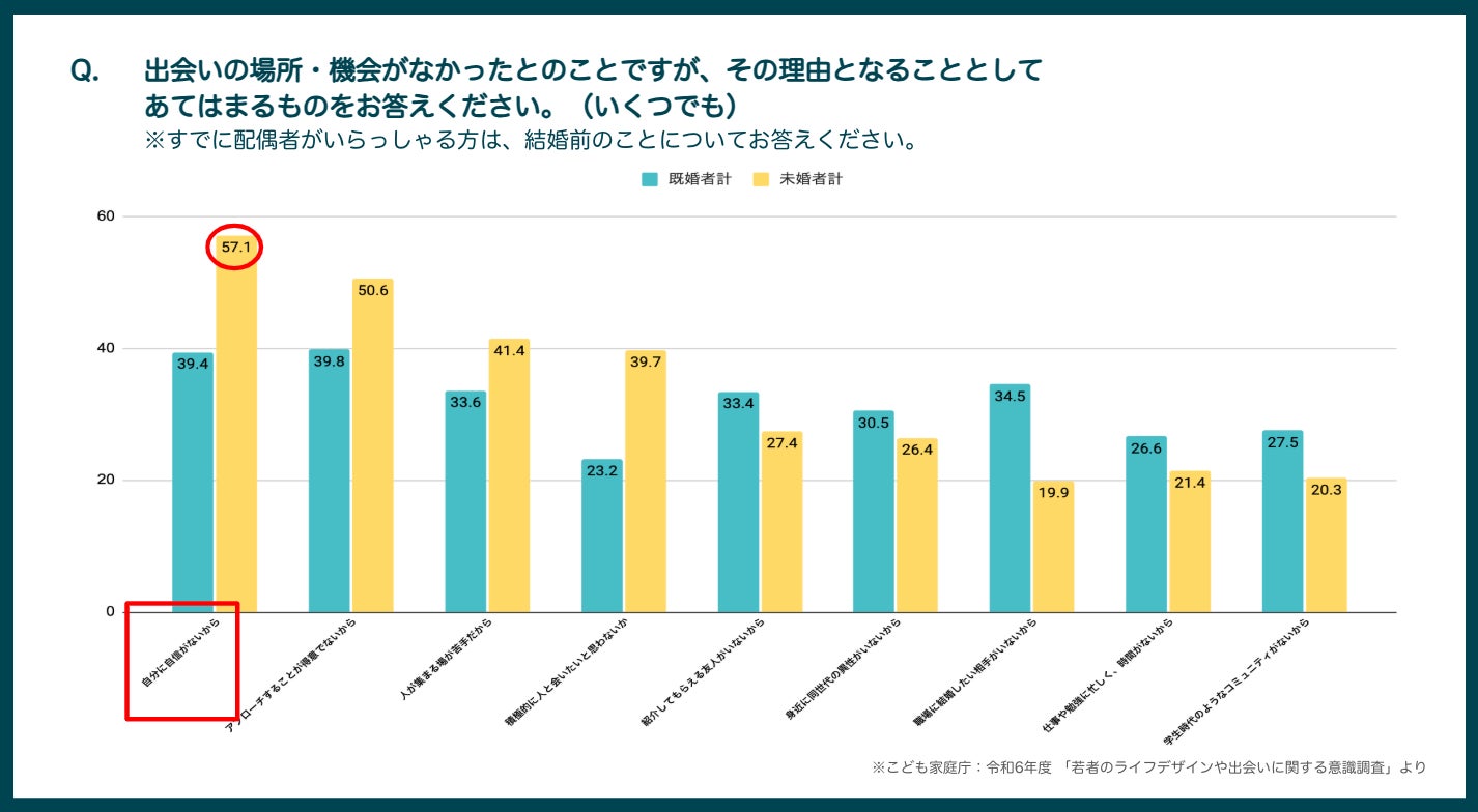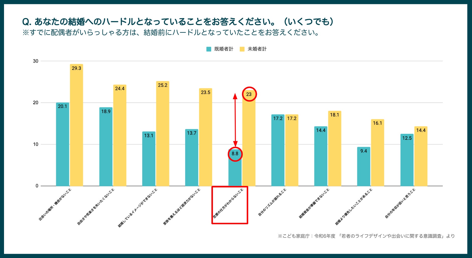 実際に、令和6年度のこども家庭庁による未婚者が結婚しない/できないの背景の調査において、既婚者と最も差が大きかった項目は「恋愛の仕方がわからないこと」でした。