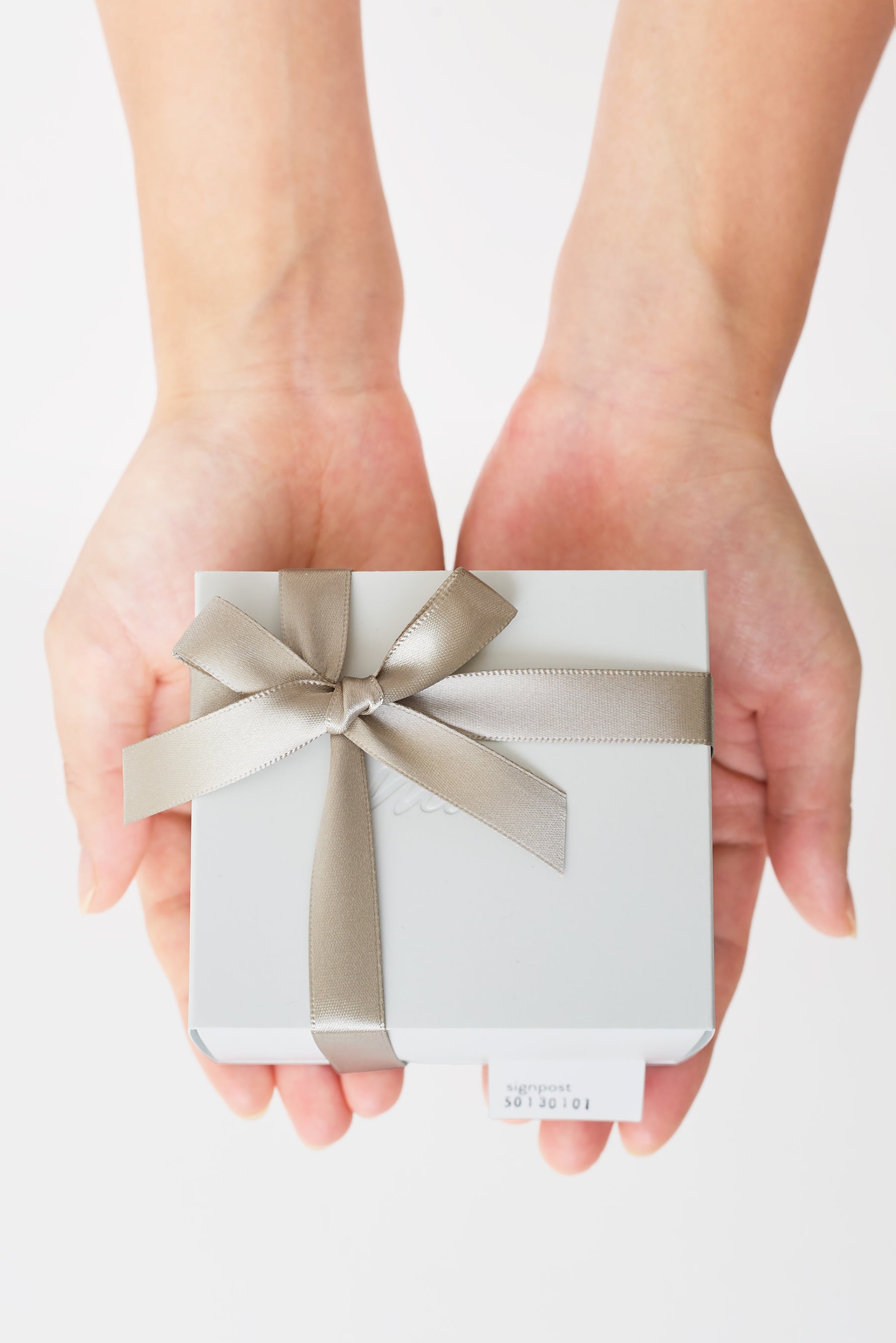 ギフト向け新パッケージは、ホワイトキューブを模したシンプルな箱型デザインです。ロゴマークを空押し加工で控えめに入れるとともに、石鹸をギャラリーに展示されたアート作品のように楽しめる台座を採用しました。ギャラリーで作品を解説するキャプションボードに見立てたシンプルなタグに商品名を記載し、台座に添えています。上品なサテン生地を使用したリボンを結んでお届けします。