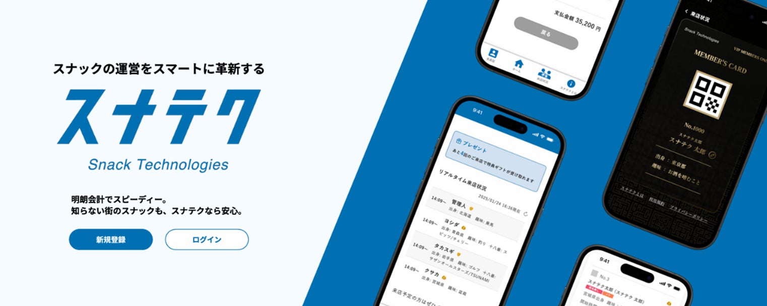 高度成長期から続く“大人の社交場”スナックは、国内だけで約10万軒が存在し、市場規模は推定2兆円超とも言われます。しかし、アナログに依存した会計や顧客管理など、不透明かつ属人的な課題が山積。スナテクは「テクノロジー × 温かな接客」の相乗効果により、このレガシー産業を大胆に変革します。