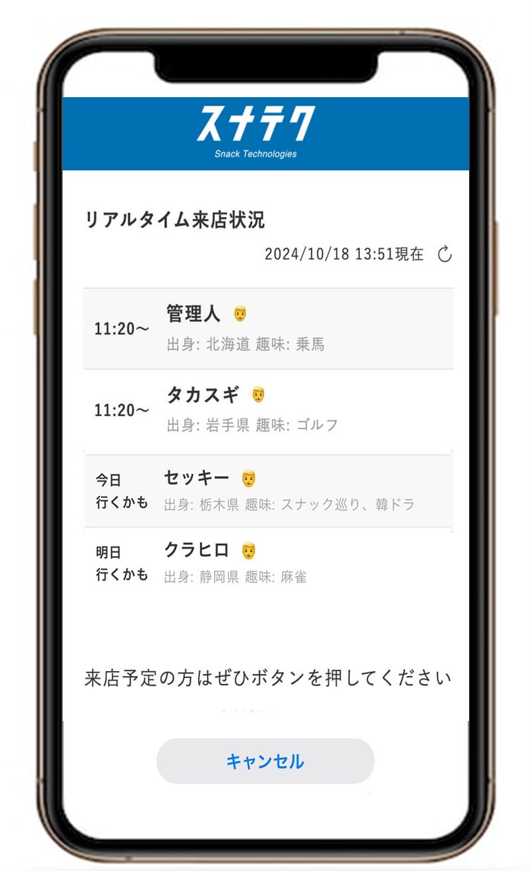 現在来店中のユーザー(ニックネーム、趣味など)や来店予定がリアルタイムで可視化。新たな集客機能として、また人々をつなぐ“新感覚の社交体験”を実現します。