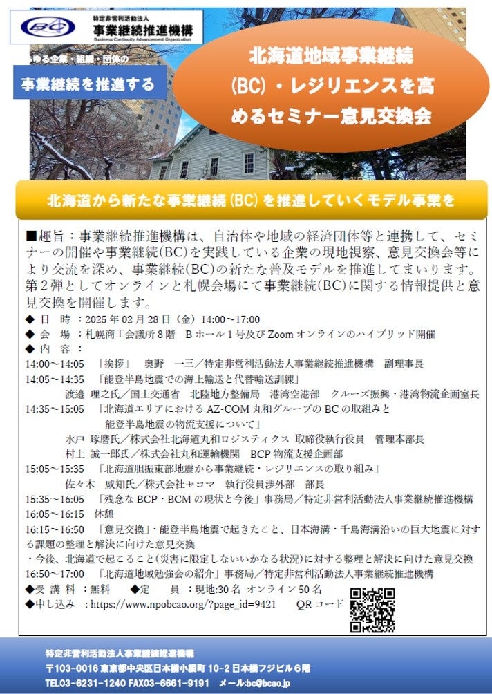 特定非営利活動法人事業継続推進機構 (本社:東京都中央区、理事長:丸谷 浩明)は、北海道で、≪北海道地域事業継続(BC)・レジリエンスを高めるセミナー、意見交換会≫を、2025年2月28日(金)に札幌商工会議所及びテレビ会議システムZoomオンラインのハイブリッドで開催いたします。