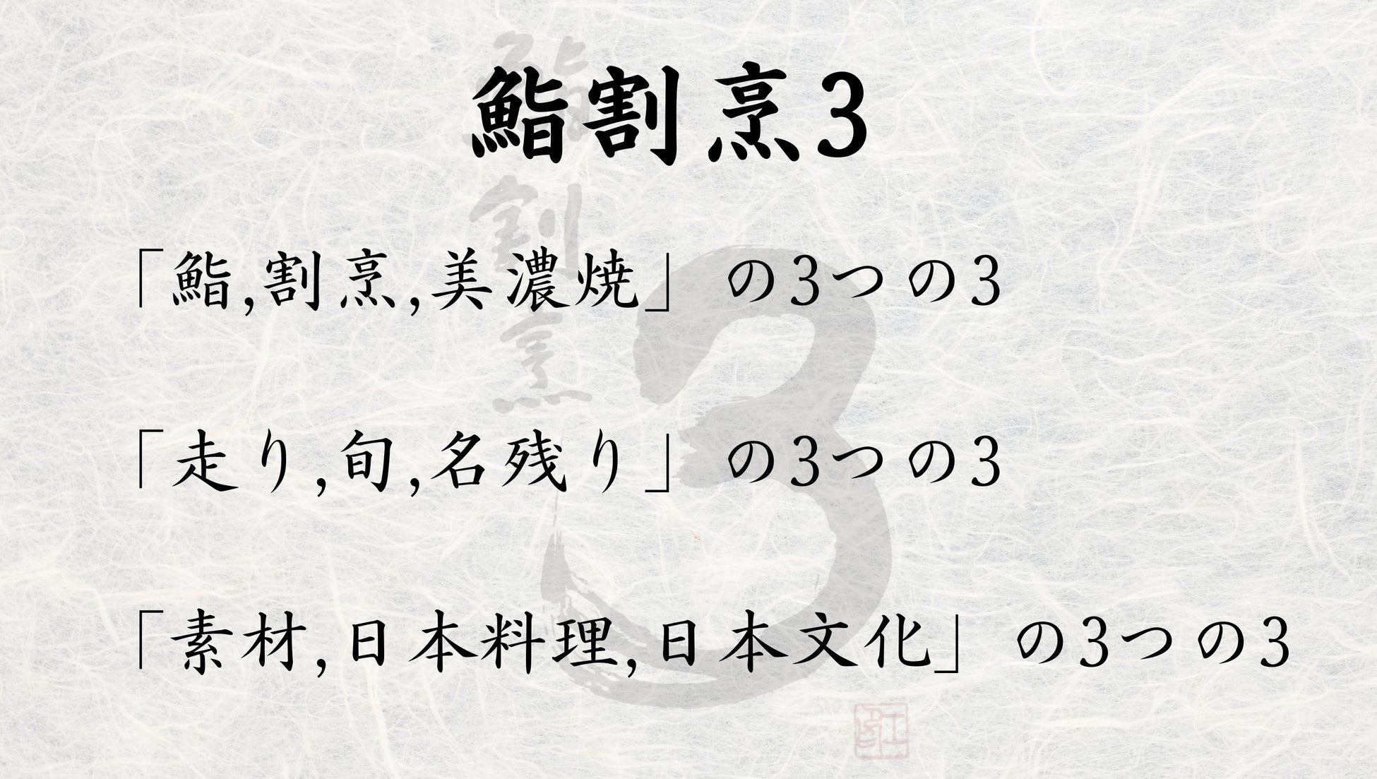 鮨と割烹・美濃焼の魅力を伝える三宅輝(みやけあきら)の新店舗 『 鮨割烹3(さん)』