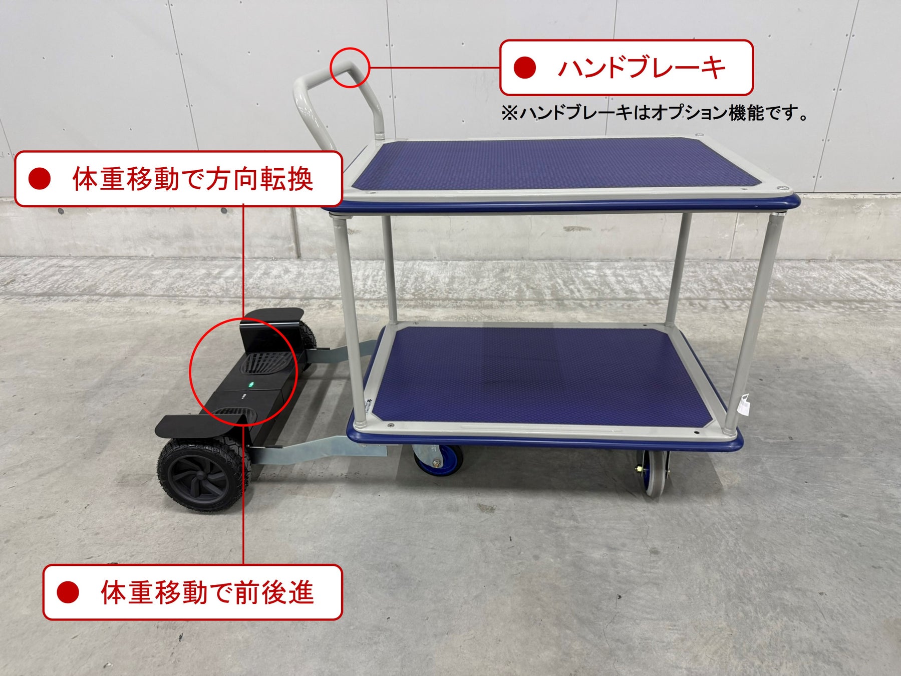 (※)オプション扱いの「ハンドブレーキ」は、どなたでも安全、確実に停止させることができ、自転車タイプのように、ハンドルにつけることはもちろん、台車の持ち手部分に取り付けることも可能です。