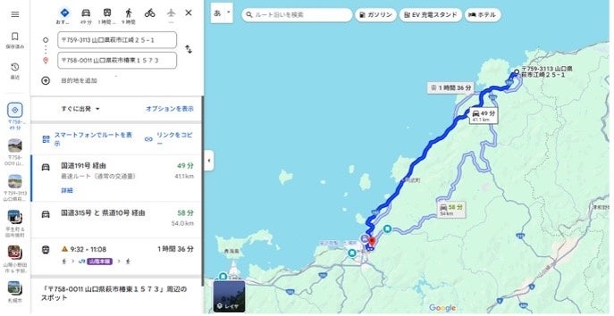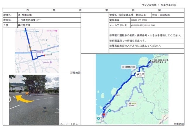 自社の住所と現場の住所を入力するとGoogleMAPと連動し、現場までの距離、時間を算出できます。