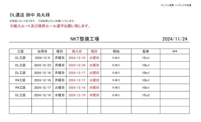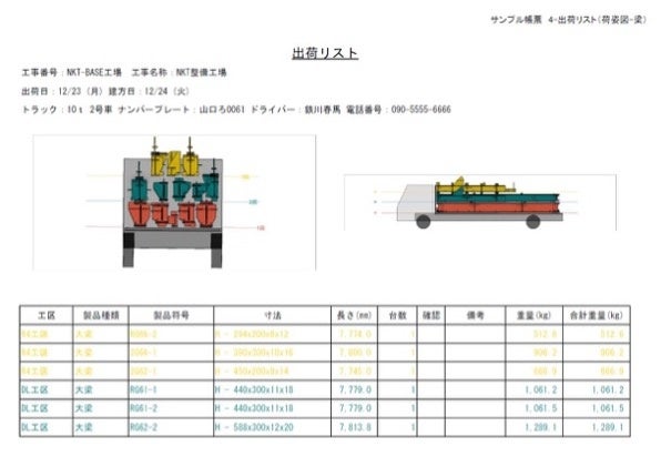 出荷表ではトラックごとの積載製品を表記でき、荷姿も掲載することが可能です。また、運送業者や元請けに提出する発注書や資料を自動作成する機能も備えています。