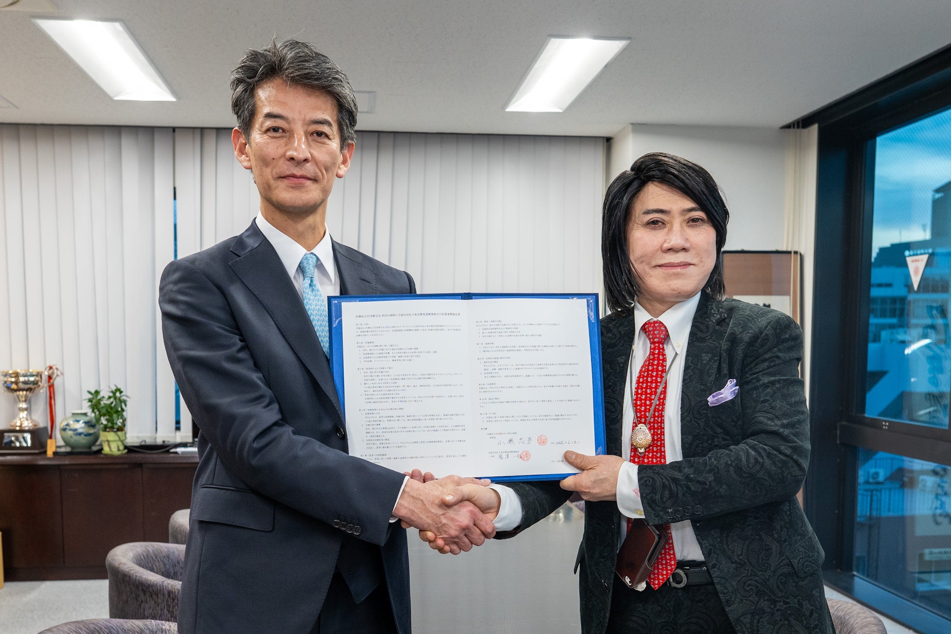 調印式には、公益社団法人東京都柔道整復師会の瀧澤一裕会長および、医療法人社団愛宝会浜田山病院の小瀬忠男理事長が出席し、双方が協力関係を強化することを確認しました。