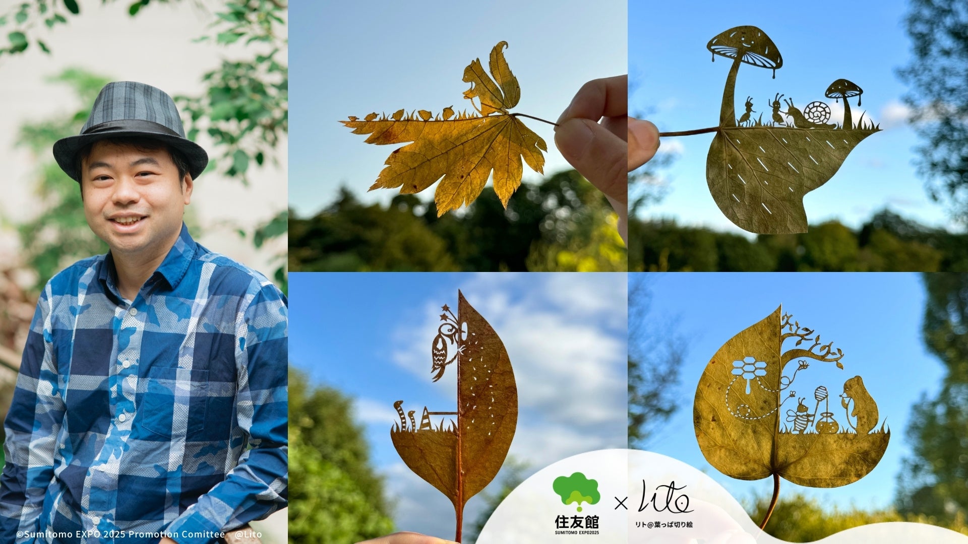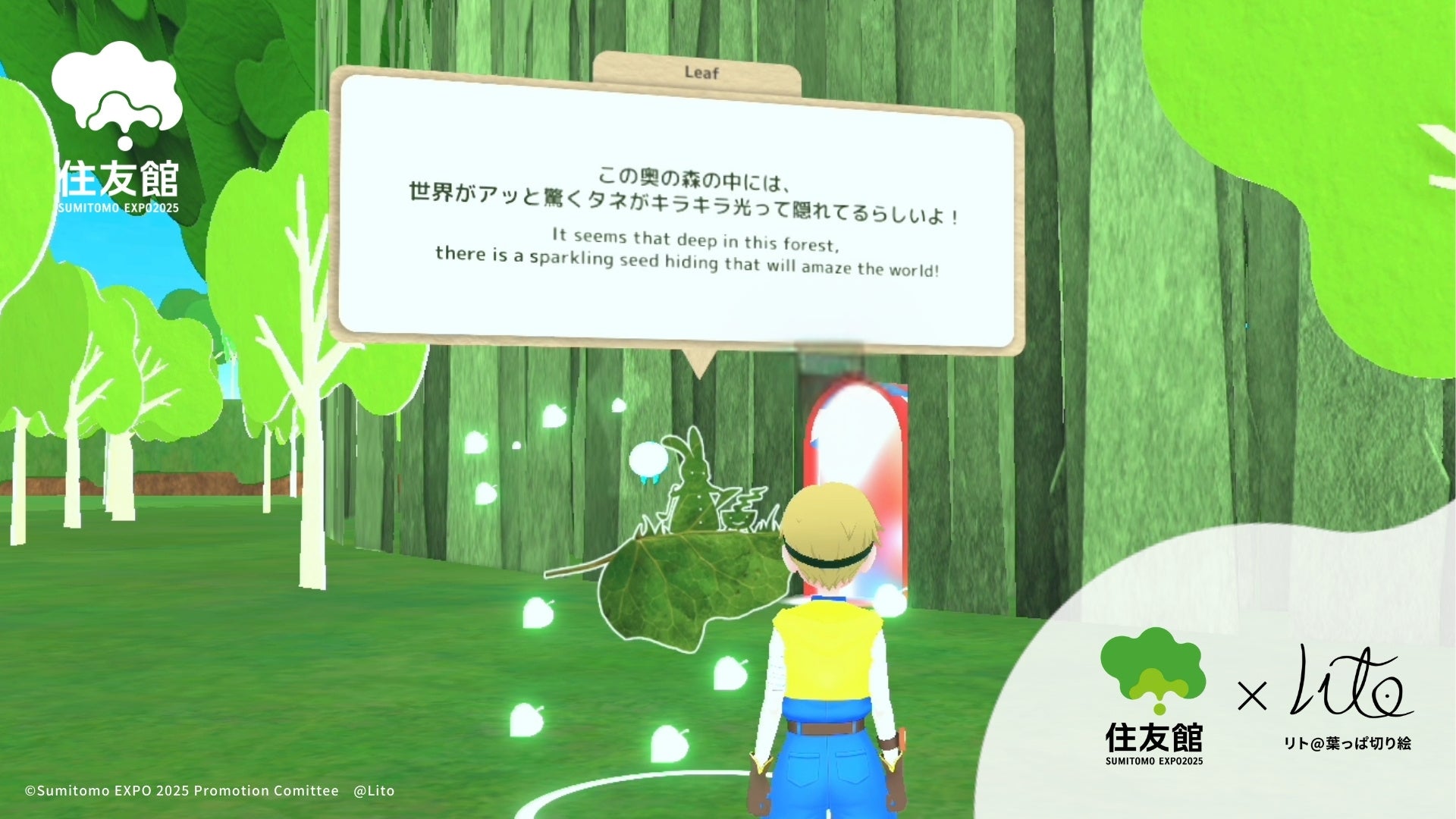 住友館との共創コラボレーションとして展示コンテンツなどを手がける「葉っぱ切り絵アーティスト」のリト氏のアート作品の一部が、バーチャル住友館にも登場します。空間内のあらゆる場所で、来場者のガイド役などとなって来場者をお出迎えします。