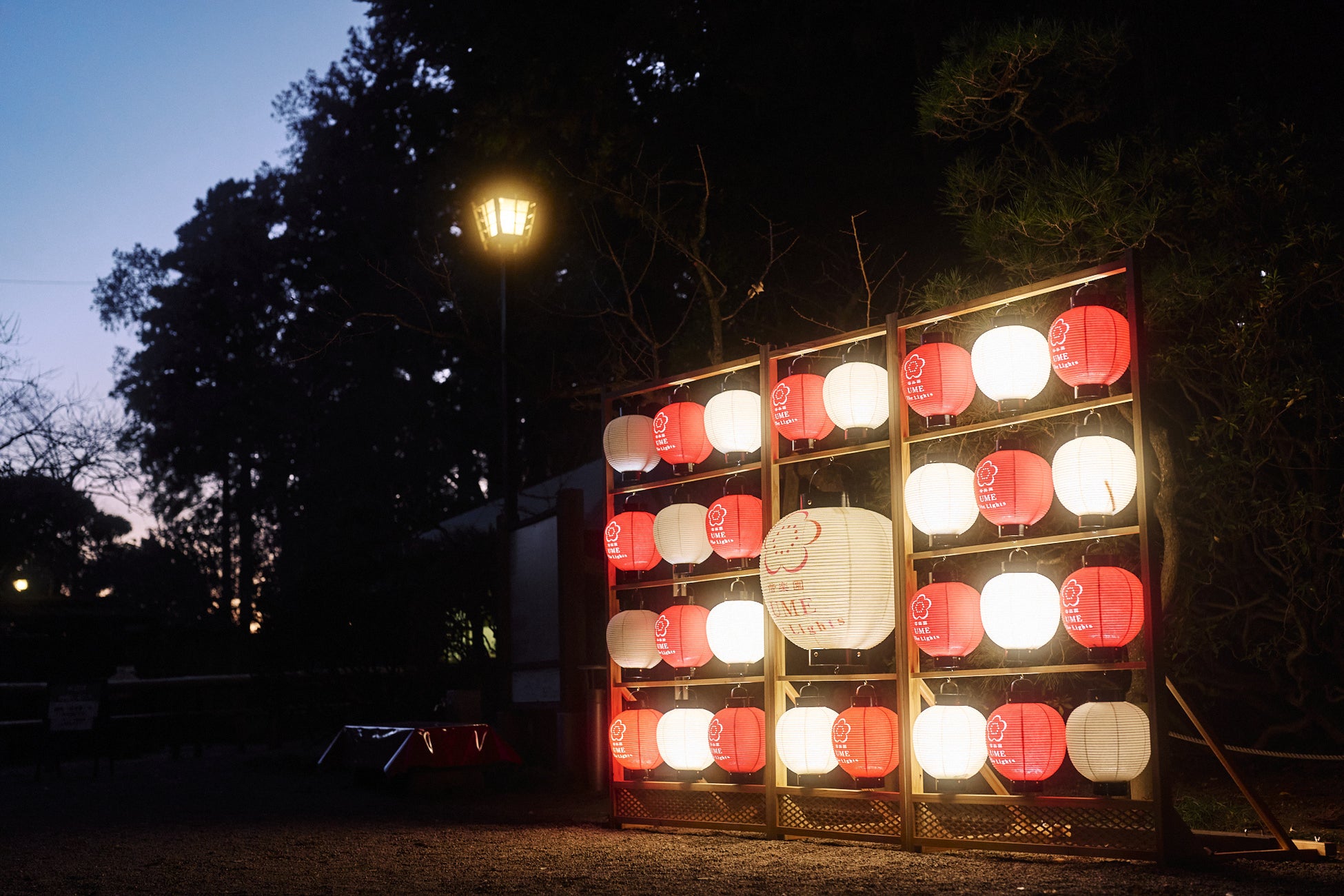 会場には、当イベントのために制作された「水府提灯」のフォトスポットを設置しています。中央の提灯と、周りの紅梅色の提灯には、「偕楽園 UME The Lights」のイベントロゴが印字されています。