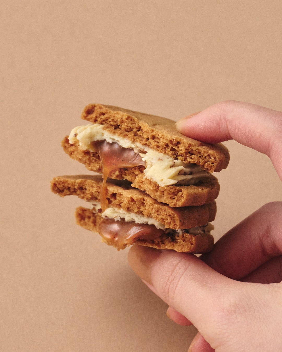 キャラメルとバターのたぶん、夢。ノーレーズンサンドイッチのバターサンドに、キャラメルく まがむぎゅっと合流。上質な素材と豊かな風味。とろけるキャラメルが幸せな余韻を生む、新しいバターサンドです。ひとつひとつ、丁寧な手仕事を重ねた味わいをお楽しみください。