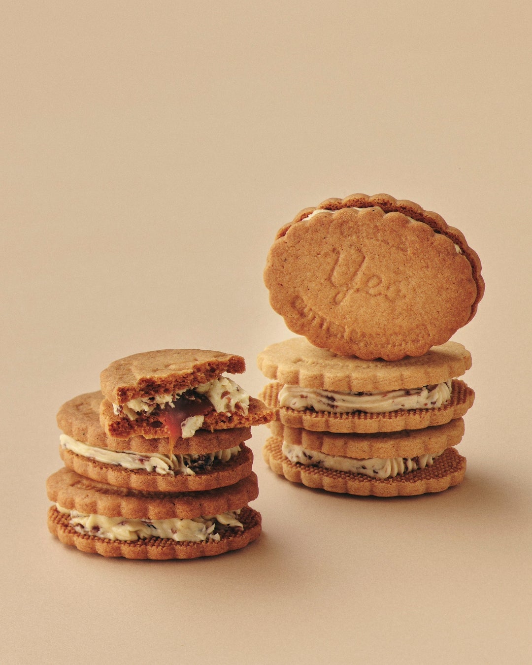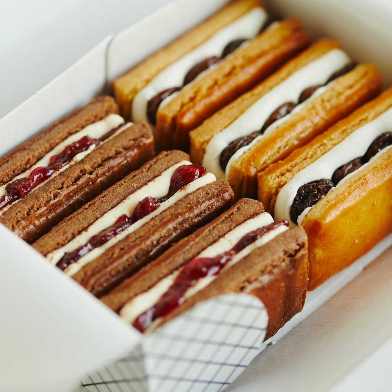 ブランド発足以来長らく愛されてきた、パティシエたちが自社工房にて丁寧に手作りするバターサンドイッチ。箱の中には、定番のレーズンサンドと、季節で変わる果実やナッツのサンドが3つ ずつ。スパイスを効かせたサブレに果実味溢れる香り高いクリームを挟んだ、ジューシーで特別なサンド菓子です。風味、食感、余韻。サブレとクリームのベストフレンドな調和をお楽しみいた だけます。レーズン好きもそうでない人も、イエスもノーも、みんなで仲良くお茶しましょう。 レシピ監修は、幡ヶ谷「Equal」のオーナーパティシエ後藤裕一氏が務めています。